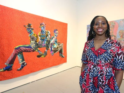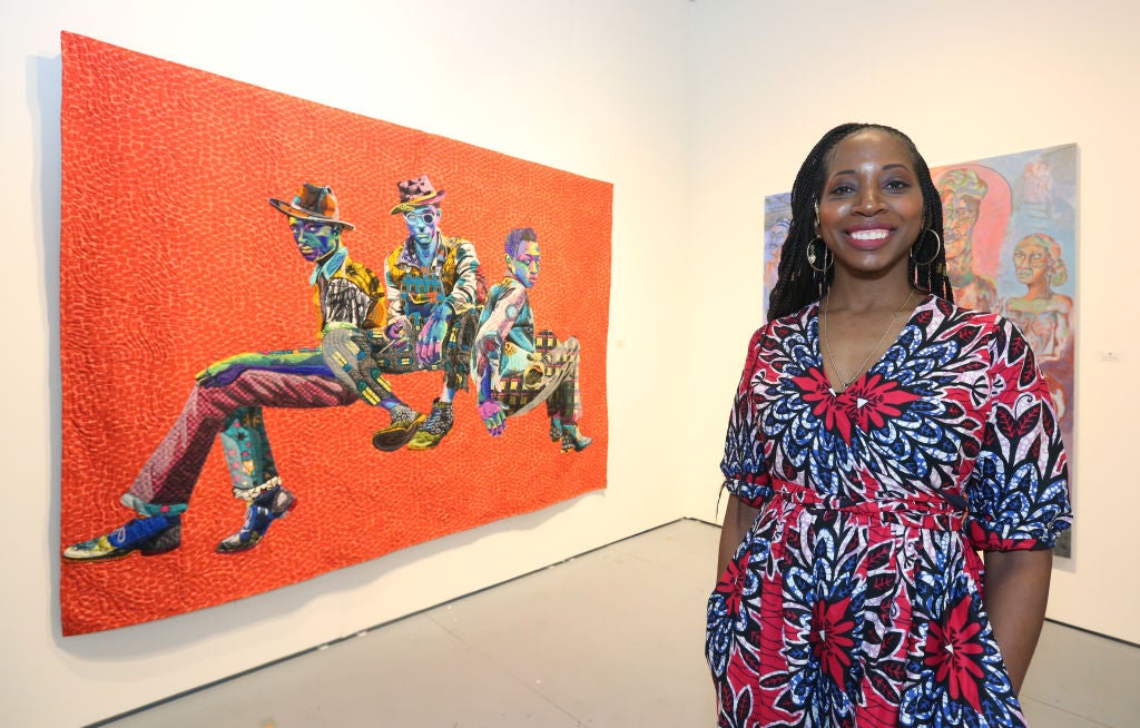 MIAMI BEACH, FLORIDA – DEC 06: Artist Bisa Butler poses with her fabric-based “Three Kings” composition presented by the Claire Oliver Gallery at the PULSE Art Fair as part of the 2018 Art Basel Miami Beach on December 6, 2018 in Miami Beach, Florida. (Photo by Sean Drakes/Getty Images)