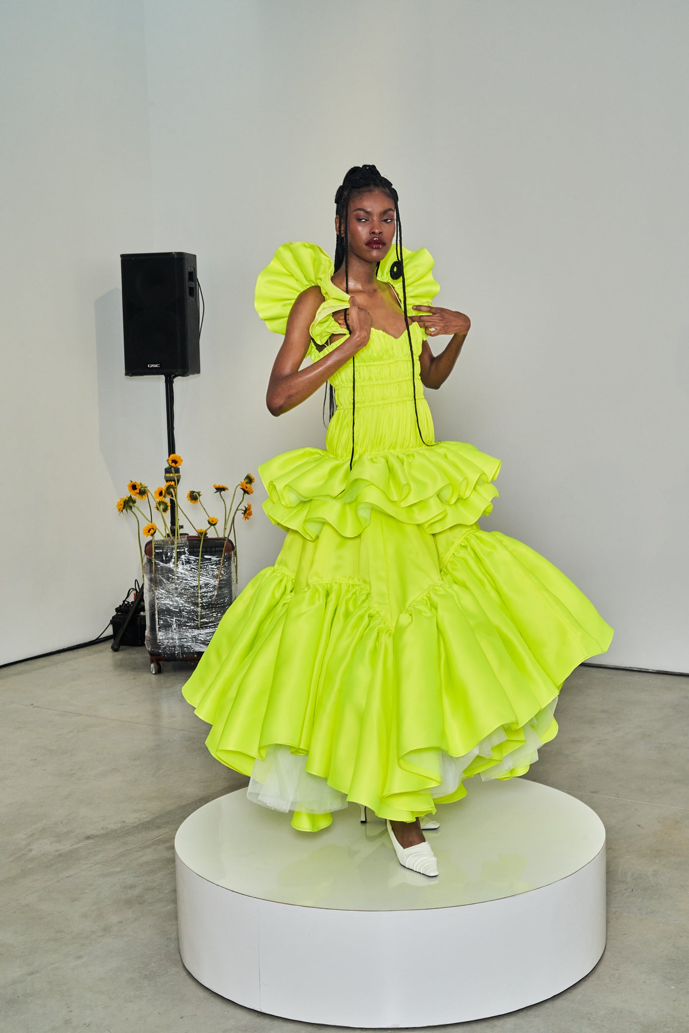 Whether it be pleating, ruffles, dramatized waists, or intricate embroidery, the designer did not miss any detail. Agbobly weaved multiple creative elements and told a cohesive story. Their ability to take a detailed orange and blue floral print and elevate it through texture, shape, and pleating received delighted gasps from several spectators in the room. A careful eye would appreciate the intricacies, such as the side panel slits, thick knit fringe, zippers that brought together the bottoms of the two yellow numbers, triangular breast pockets, and a layered knit collar, to name a few.