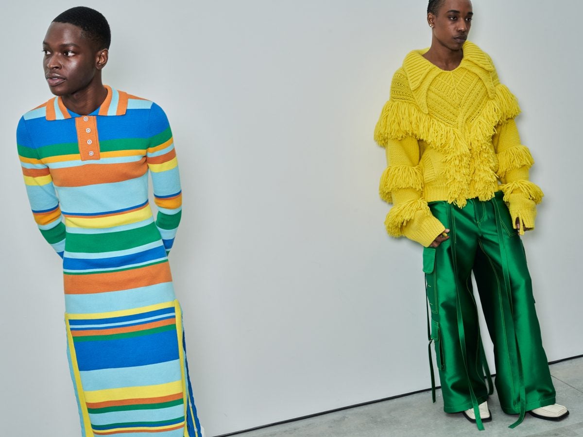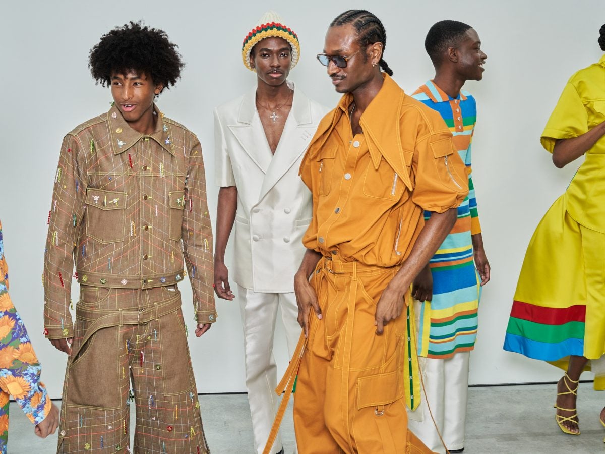The designer described the collection as a “vibrant kaleidoscope of hues” and that it was. An assemblage of both radiant and earth-toned menswear and womenswear displayed Agbobly’s craftsmanship and incredible tailoring. Standouts include a bright yellow two-piece ensemble trimmed with red, green, and blue blocked stripes with a drawstring-cinched back that hugged the model’s silhouette. An electric yellow dress with a ruched midsection, expansive ruffle train, and blooming sleeves was positioned next to a shorter, cream-colored version of the same design.