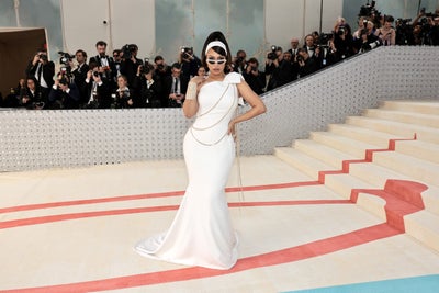 Aside from hosting the carpet prior, Anthony is no stranger to attending the event as a guest herself. She’s also been known to collaborate with Black designers over the years. From 2019’s Camp 100 dollar gown designed by Pyer Moss’s Kerby Jean Raymond and 2014’s Charles James-themed carpet wearing Cushnie et Ochs to last year’s LaQuan Smith ensemble. And tonight, she continues that thread of championing black designers wearing a custom look by the Sergio Hudson. A white one-shoulder dress adorned with gold chains and accessorized with pearl sunglasses — very much alluding to the essence of Karl’s Chanel.