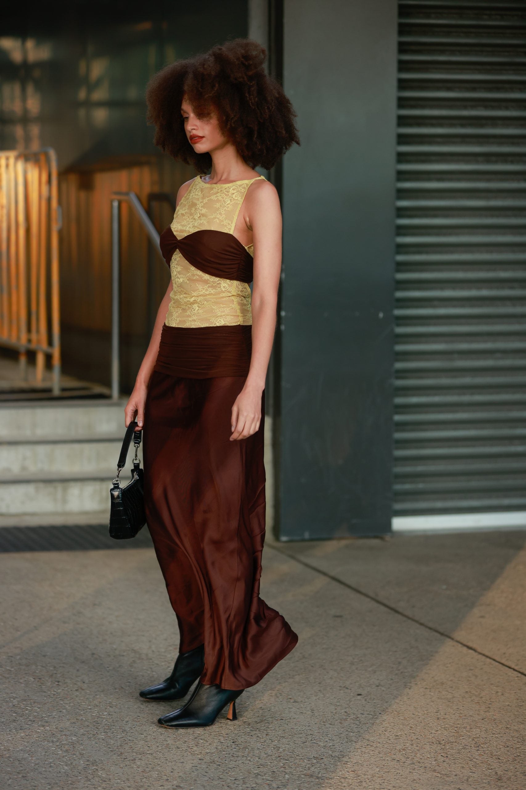 SYDNEY, AUSTRALIA – MAY 16: A guest wearing Bec and Bridge yellow lace top and brown silky skirt at Afterpay Australian Fashion Week 2023 at Carriageworks on May 16, 2023 in Sydney, Australia. (Photo by Hanna Lassen/Getty Images)