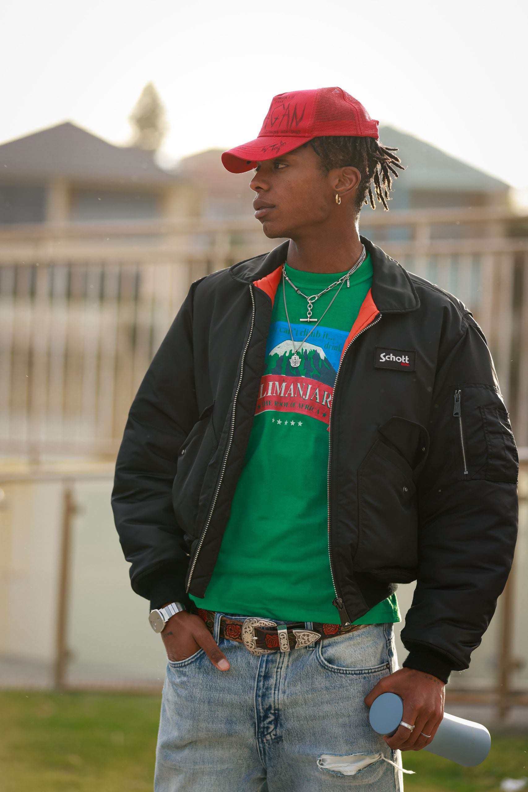 SYDNEY, AUSTRALIA – MAY 17: A guest wearing red cap, green t-shirt and black bomber jacket at Afterpay Australian Fashion Week 2023 at Carriageworks on May 17, 2023 in Sydney, Australia. (Photo by Hanna Lassen/Getty Images)