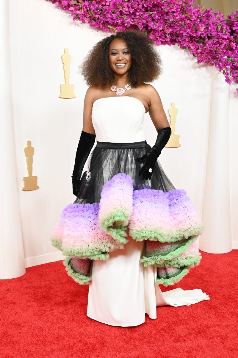 Da’Vine Joy Randolph who has been racking up wins this awards season was ravishing in a jewel-encrusted light blue gown by Louis Vuitton. Randolph took home an Oscar for Best Supporting Actress for her role in The Holdovers. Issa Rae who starred in the Greta Gerwig-directed film Barbie wore a killer Ami Paris low-cut glitzy bodice gown in a deep green hue with a velvet train. Cynthia Erivo was alluring in a rich purple-hued Louis Vuitton gown with splendid details.