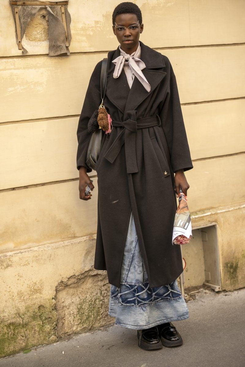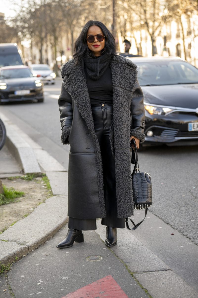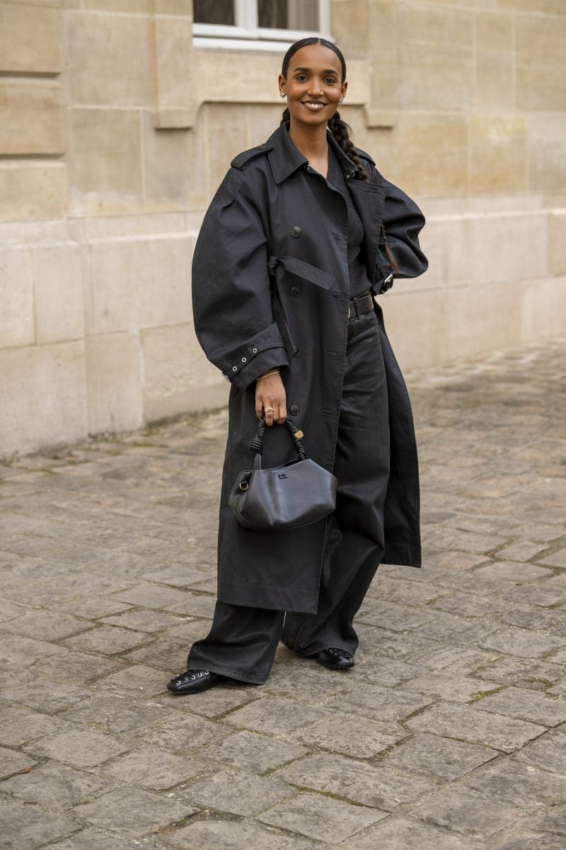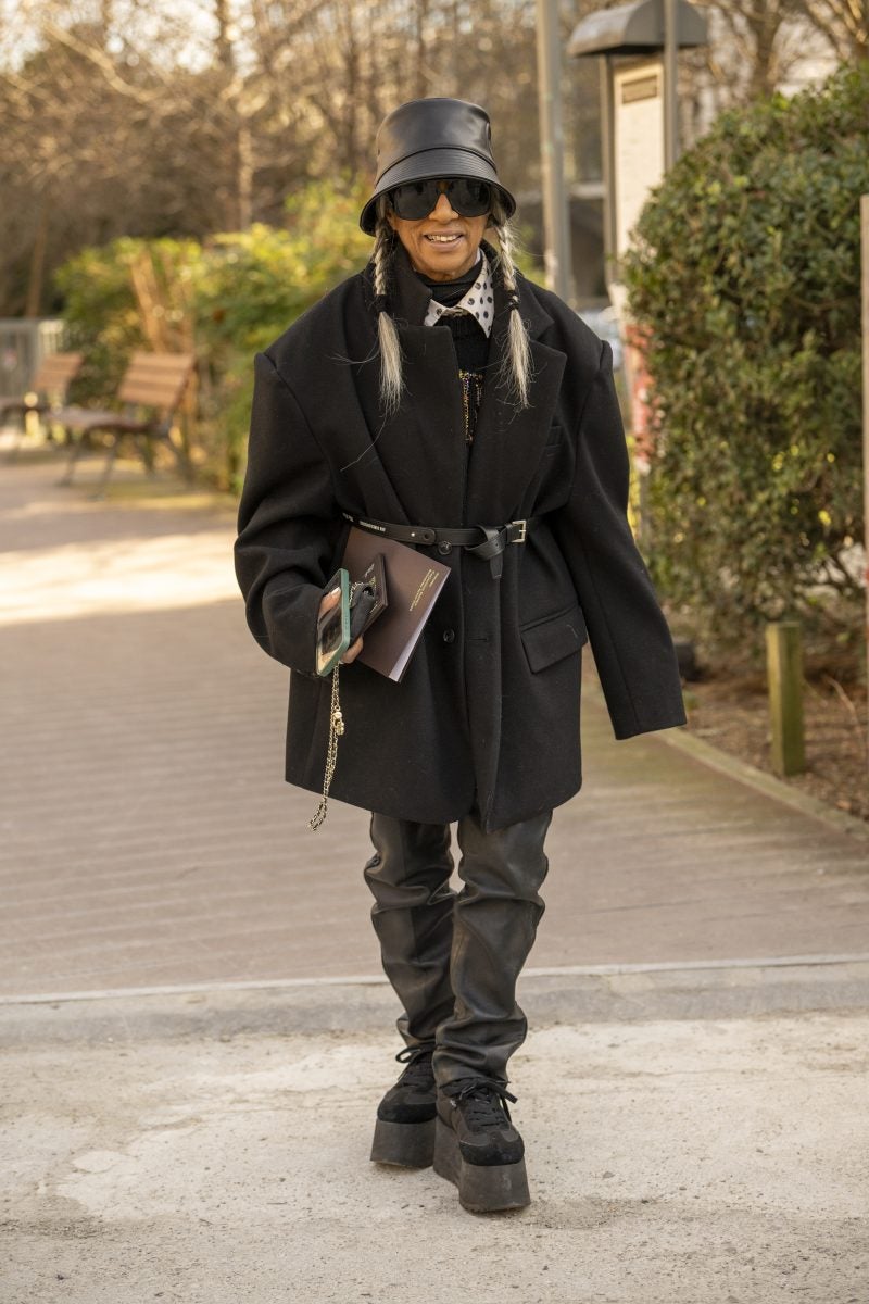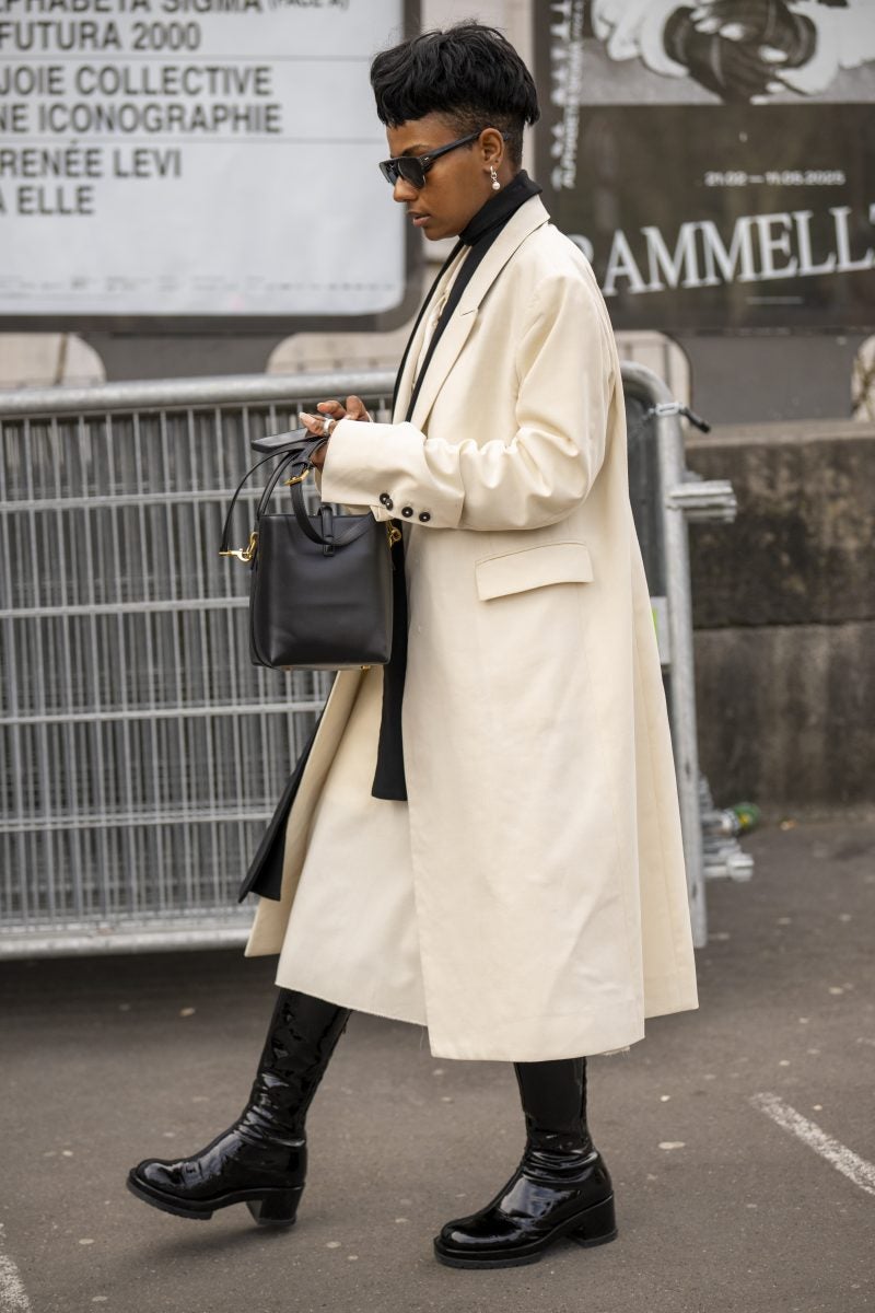 To PFW, stylist extraordinaire and New York native Patti Wilson wore an oversized blazer with a patterned white button-up underneath. A pair of baggy leather jeans, a bucket hat and chunky footwear both in black were also a part of her outfit. Another striking capture: stylist Julia-Sarr Jamois who wore a tan trench coat with a grey mock neck sweater. Both of these outfits showcase the boundaries that those who love personal style can play up while hitting shows.