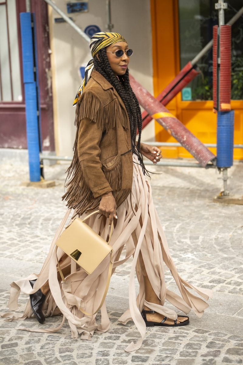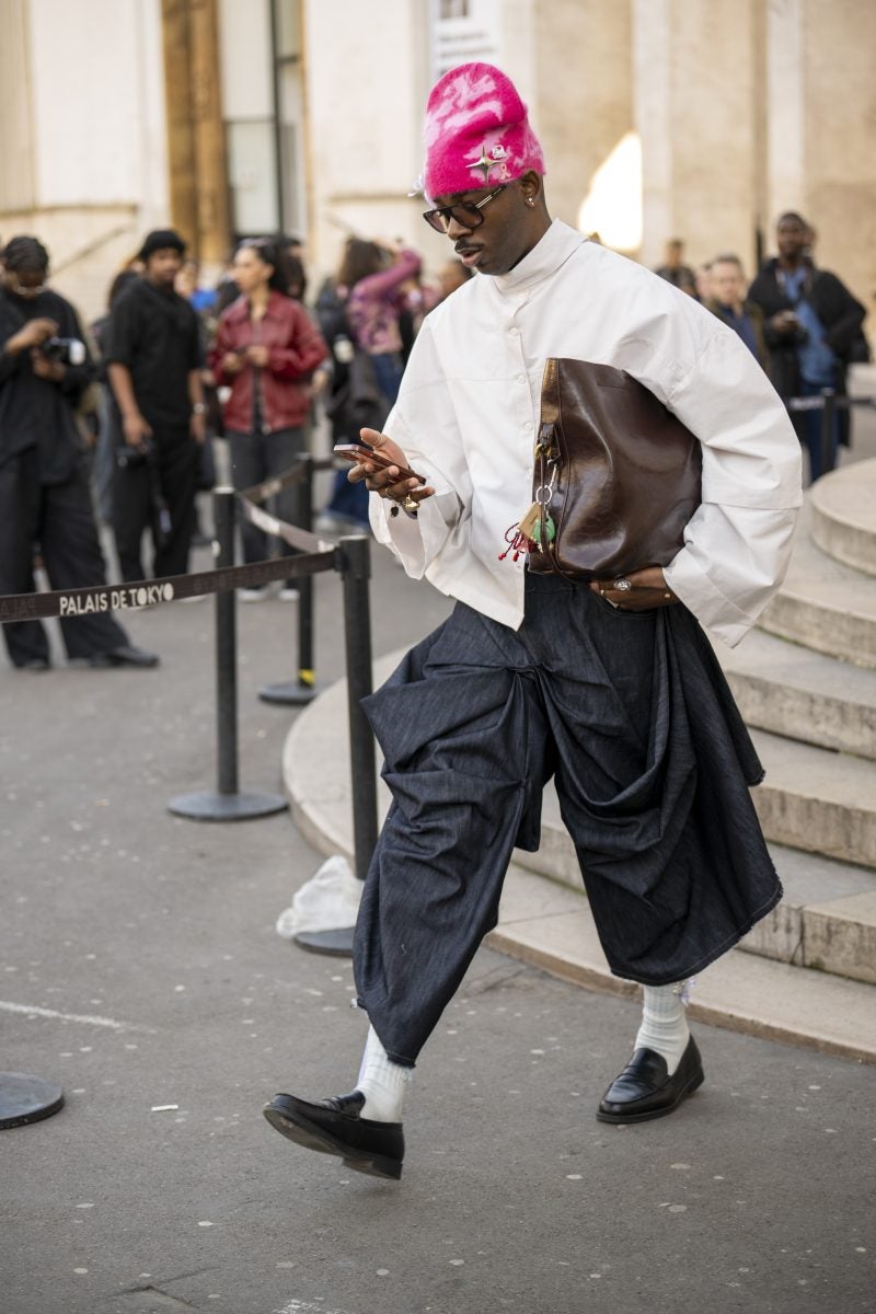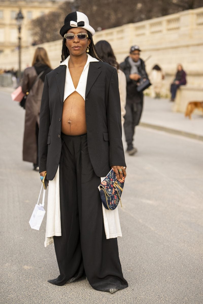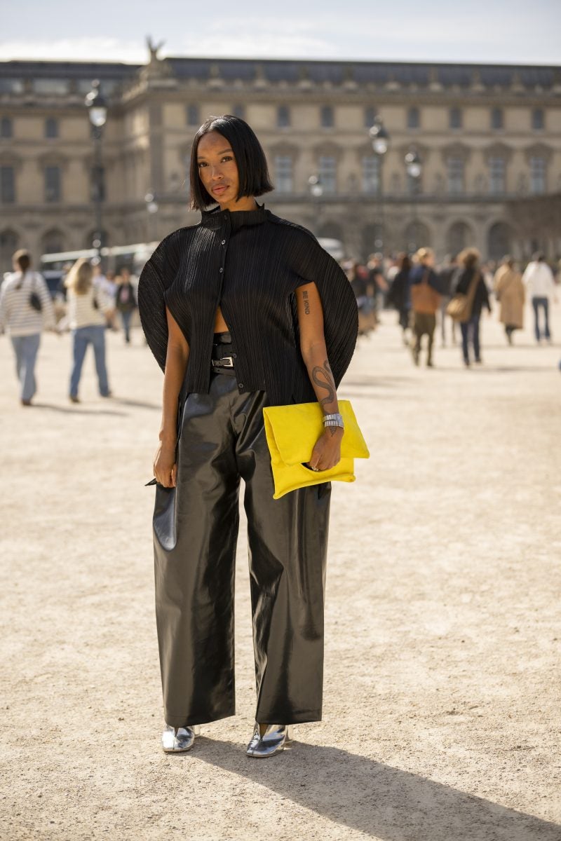 To PFW, stylist extraordinaire and New York native Patti Wilson wore an oversized blazer with a patterned white button-up underneath. A pair of baggy leather jeans, a bucket hat and chunky footwear both in black were also a part of her outfit. Another striking capture: stylist Julia-Sarr Jamois who wore a tan trench coat with a grey mock neck sweater. Both of these outfits showcase the boundaries that those who love personal style can play up while hitting shows.