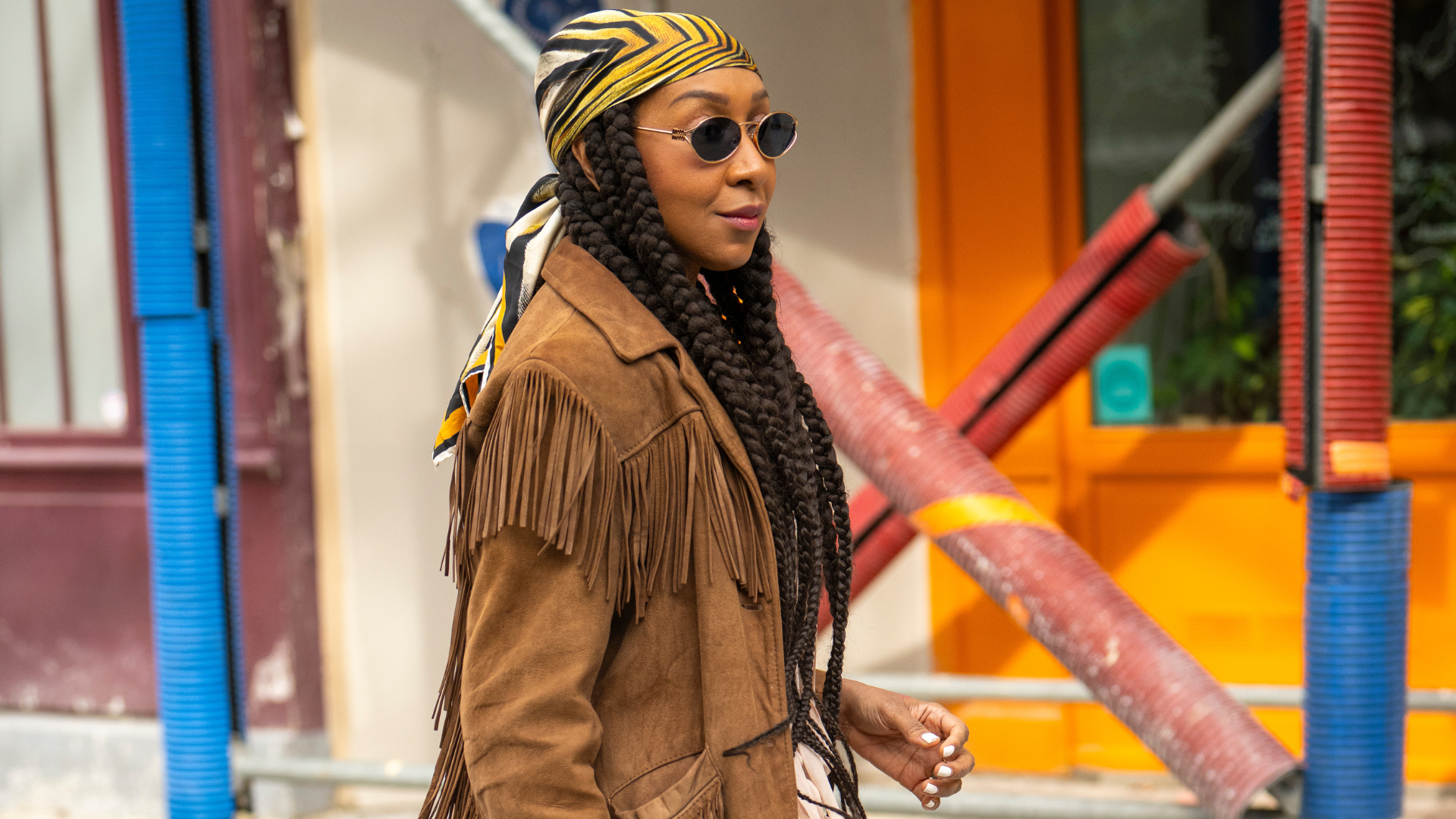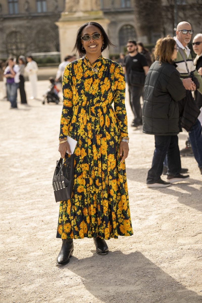 Another showgoer, content creator Karen Blanchard donned a boho-inspired look for the Akris presentation. Her oufit consisted of a dress with rectangular strips that fell elegantly, with this piece she wore a brown suede jacket, and strappy leather shoes with interesting straps. Vanity Fair fashion director Nicole Chapoteau wore a vibrant yellow floral dress to attend shows. This outfit points to the spring weather that is currently on the horizon.