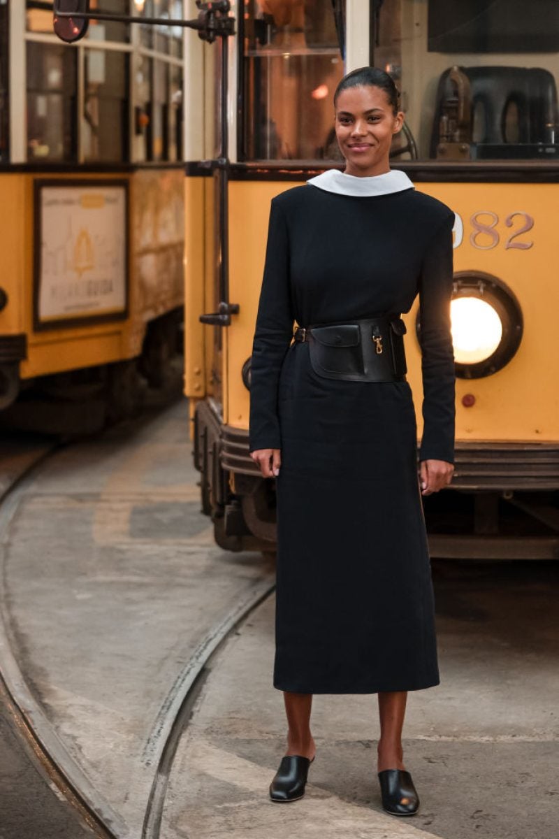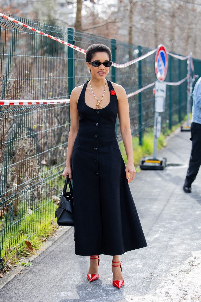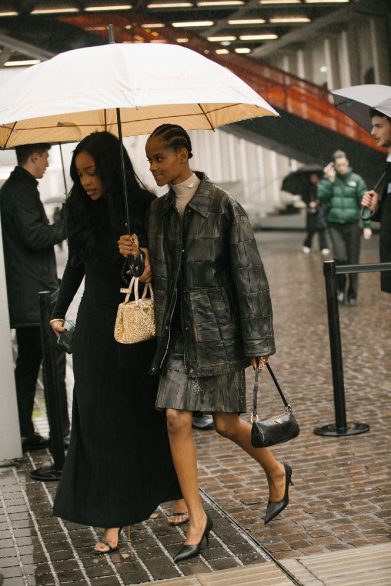 Stylist Gabrielle Karefa-Johnson made a minimal look fun by adding a tone of green into the mix. Her light green trench coat was tied at the waist over a nude dress. She added black pointed-toe heels and a white handbag to complete her look. Singer Kelela wore a sheer black slip dress over thigh-high leather boots with an added layer of a black shawl, adding a gothic element to what would’ve been a simple look. Lastly, we spotted actress Letitia Wright in a leather skirt and jacket that gave an edgy update on “officecore.” The dark leather in contrast to her nude turtleneck top and her black pointed-toe heels and Prada bag were an ideal pairing.