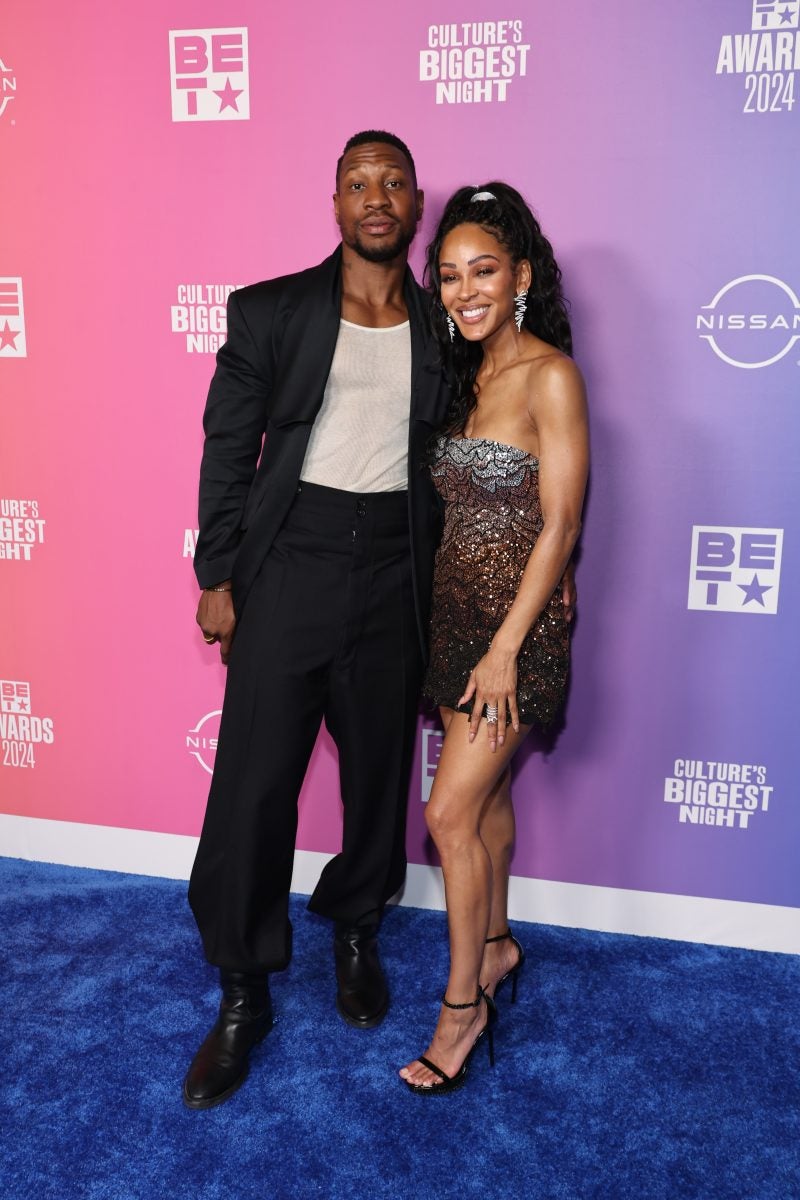 LOS ANGELES, CALIFORNIA – JUNE 30: (L-R) Jonathan Majors and Meagan Good pose in the press room during the 2024 BET Awards at Peacock Theater on June 30, 2024 in Los Angeles, California. (Photo by Amy Sussman/Getty Images)