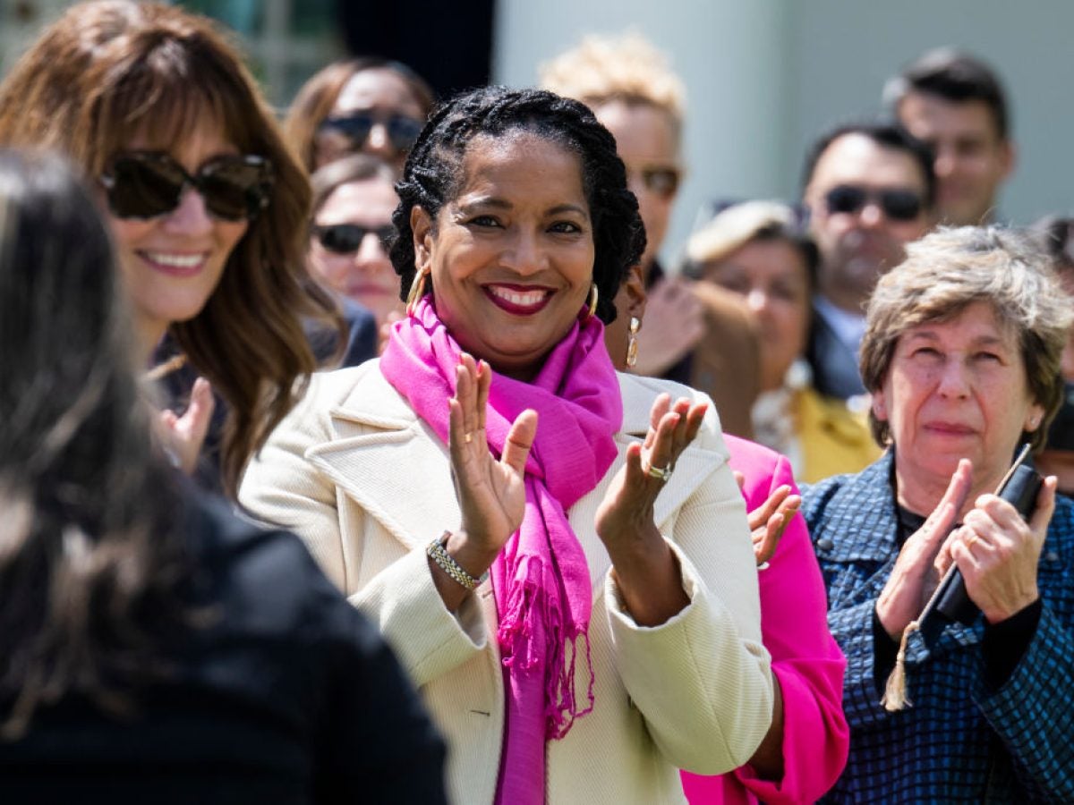 UNITED STATES – APRIL 24: Rep. Jahana Hayes, D-Conn., center, 2016 National Teacher of the Year, and Randi Weingarten, right, president of the American Federation of Teachers, attend the Council of Chief State School Officers’ 2023 Teachers of the Year event in the White House Rose Garden on Monday, April 24, 2023. The event was held to honor educators from across the U.S. for their “excellence in teaching and commitment to students’ learning.” (Tom Williams/CQ-Roll Call, Inc via Getty Images)