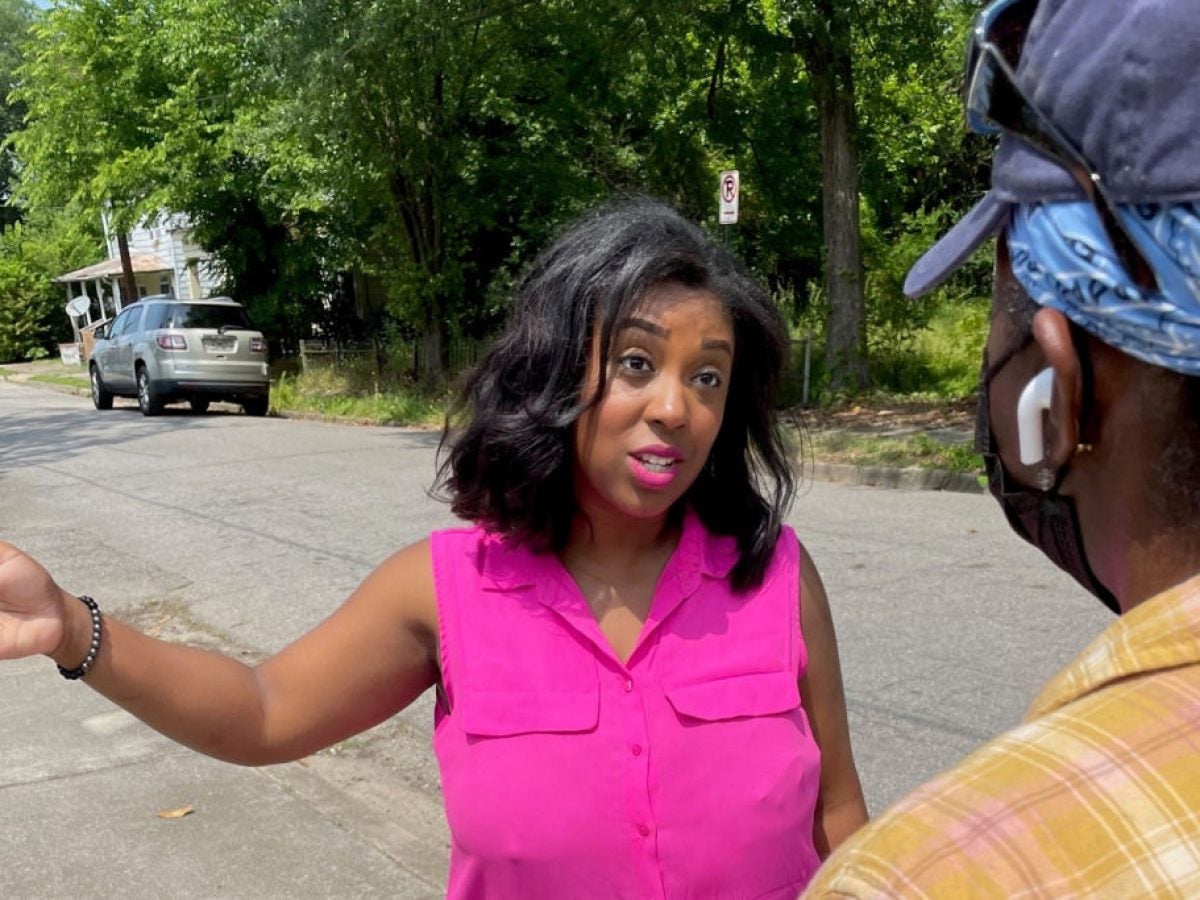 PETERSBURG, VA – MAY 18: Former Virginia Del. Lashrecse Aird, left, talks withwith Petersburg resident Jean Lewis on May 18, 2023 as she campaigns in the Democratic primary for a newly drawn state Senate district against Sen. Joe Morrissey.