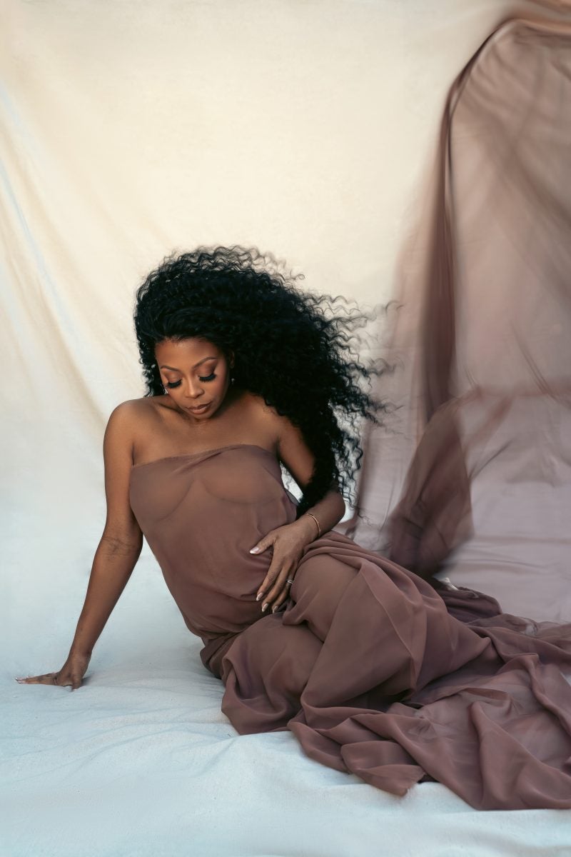 Webb says the joy that was evoked during this shoot was needed. “I’m so happy that I’ll have those photos to look back on–I love glam, I love fashion and I wanted to do something dramatic for my maternity shoot.” The Monsoori black gown with decadent sleeves and the hunter green ensemble by Guarav Gupta look exquisite on the actress. Intentional additions like the makeup by Rebekah Alladin in addition to the gorgeous hair by Sharif Poston were elegant touches that further exhibit the beauty of collaborative efforts. Getting dressed up and being pampered for the day was a moment where Webb was able to consciously dwell in a fashion-forward environment again.