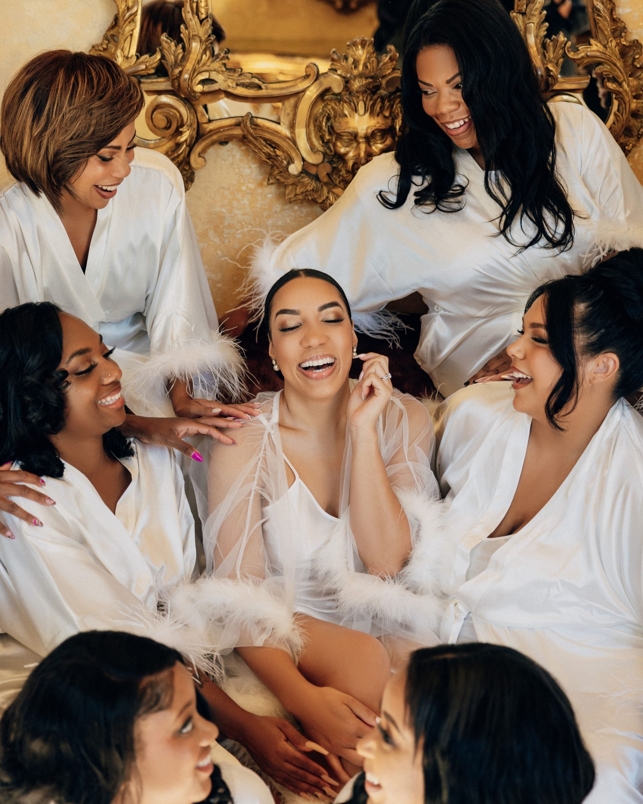 A gleeful and glamorous Amber is surrounded by her beautiful bridesmaids as she prepares for the ceremony.