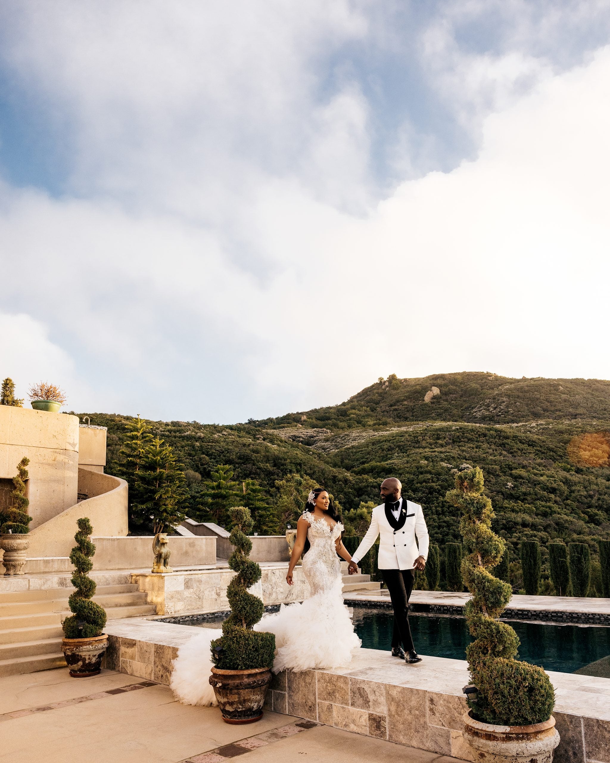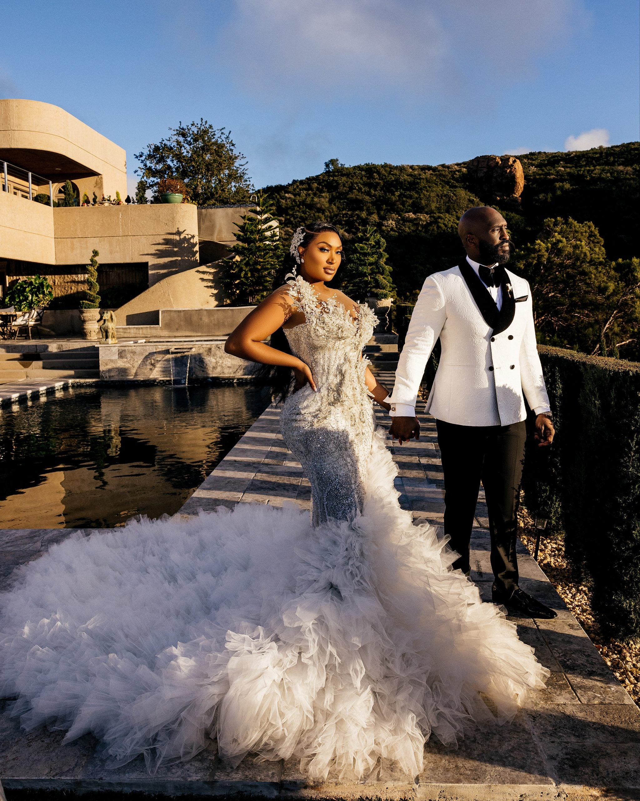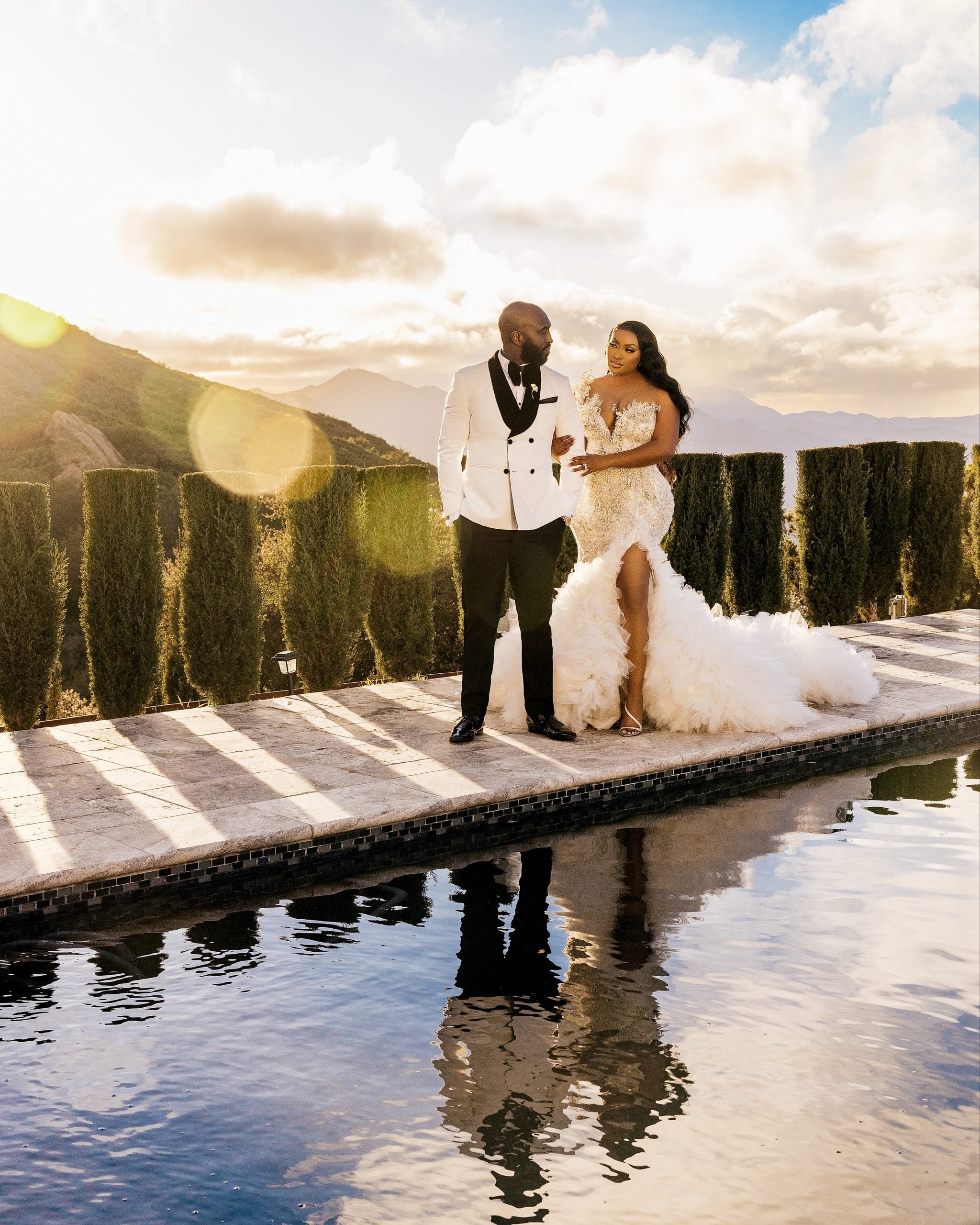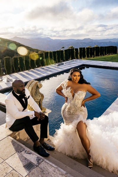 The couple just wed in a surprise ceremony at Malibu’s Stone Mountain Estate in Calabasas, Calif. surrounded by natural wonders, including mountains. The bride wore a Matopeda Atelier gown and the couple’s wedding and post-ceremony photo shoot was captured by popular celebrity photographer Stanley Babb of Stanlo Photography.