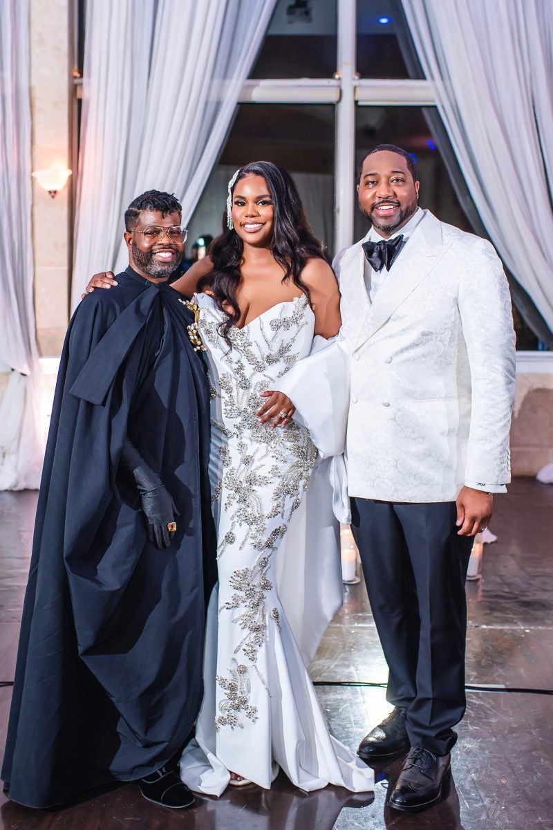 The couple took pictures with all of their guests, including Elise’s reception gown designer, Anthony Elle, who she’s known for years. Her request for a gown brought him out of semi-retirement. “Not only did he hand sew my gown adding beautiful crystals, a cape and surprised me with a handmade headpiece; he also flew from LA to Atlanta to do the fitting and returned to not only attend the wedding but style me for the day,” Elise says. “He was a vital part of our wedding day and I am eternally grateful for his expertise, his craftsmanship but more importantly, his friendship.”