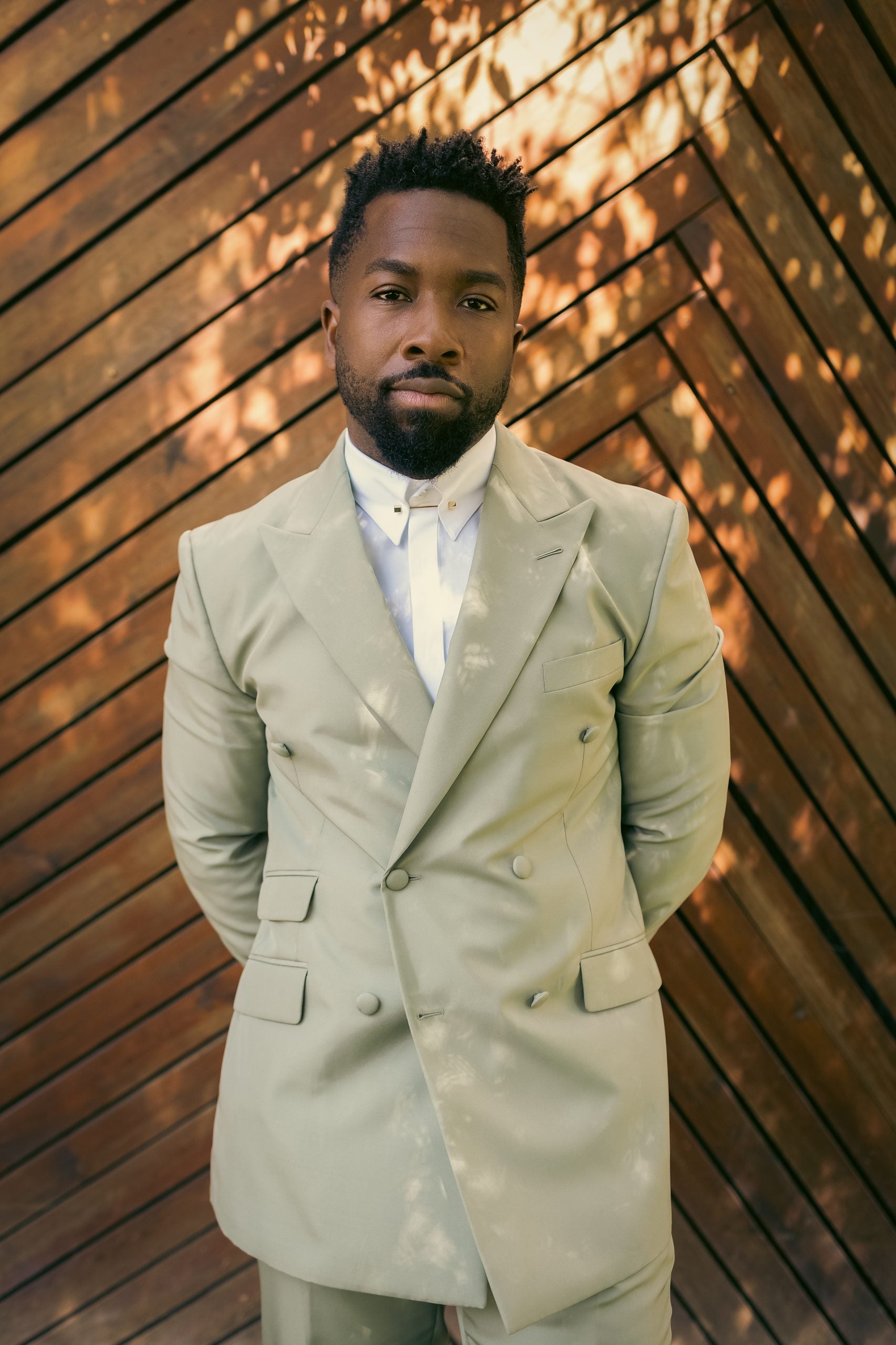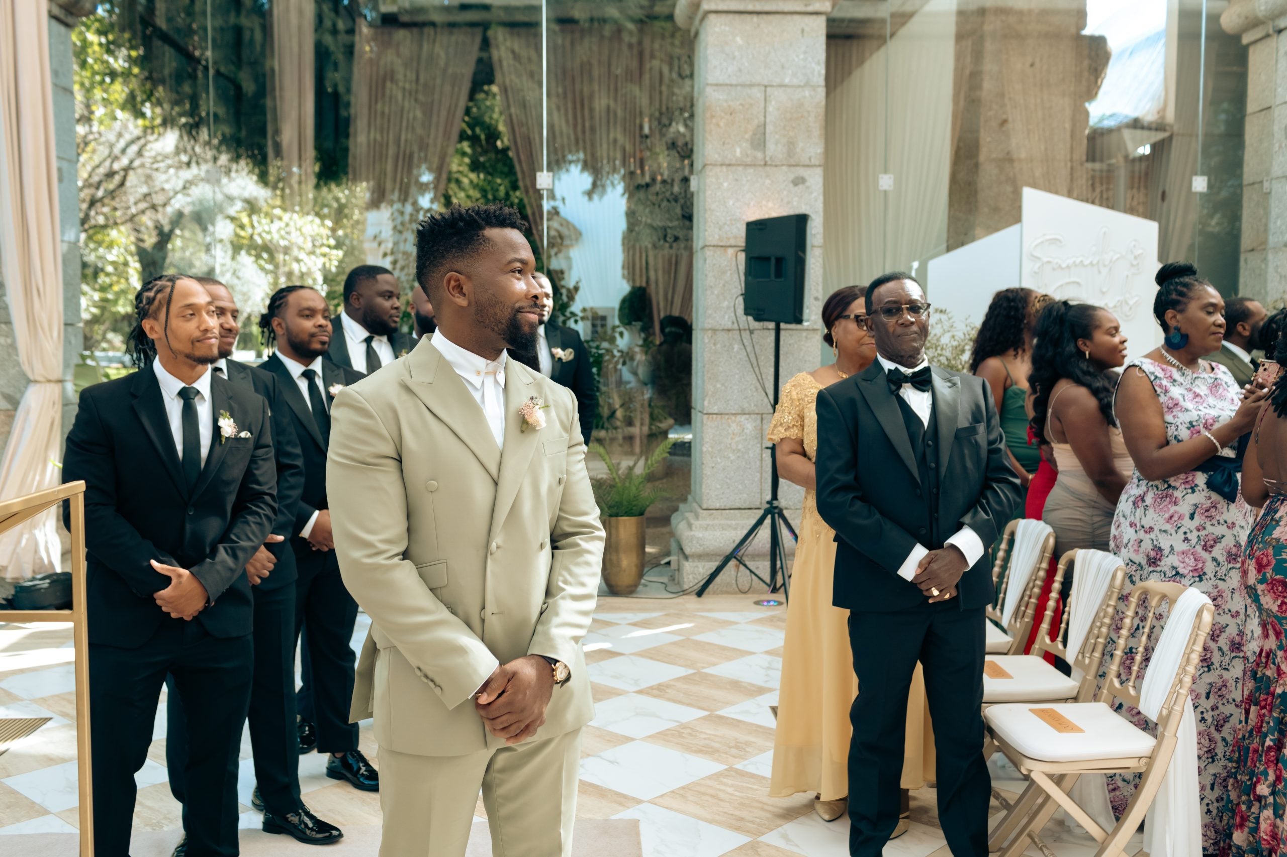 “My designer was Perkens Bien Aime, and we sourced the materials for my suit together,” Jean says of the Haitian tailor and designer. “We had some hiccups in finding the right fabric that matched the aesthetic Randall and I were going for, but it all came together literally four days before I had to hop on a flight to Portugal. We went with neutral tones for our wedding because we wanted the venue to shine.”