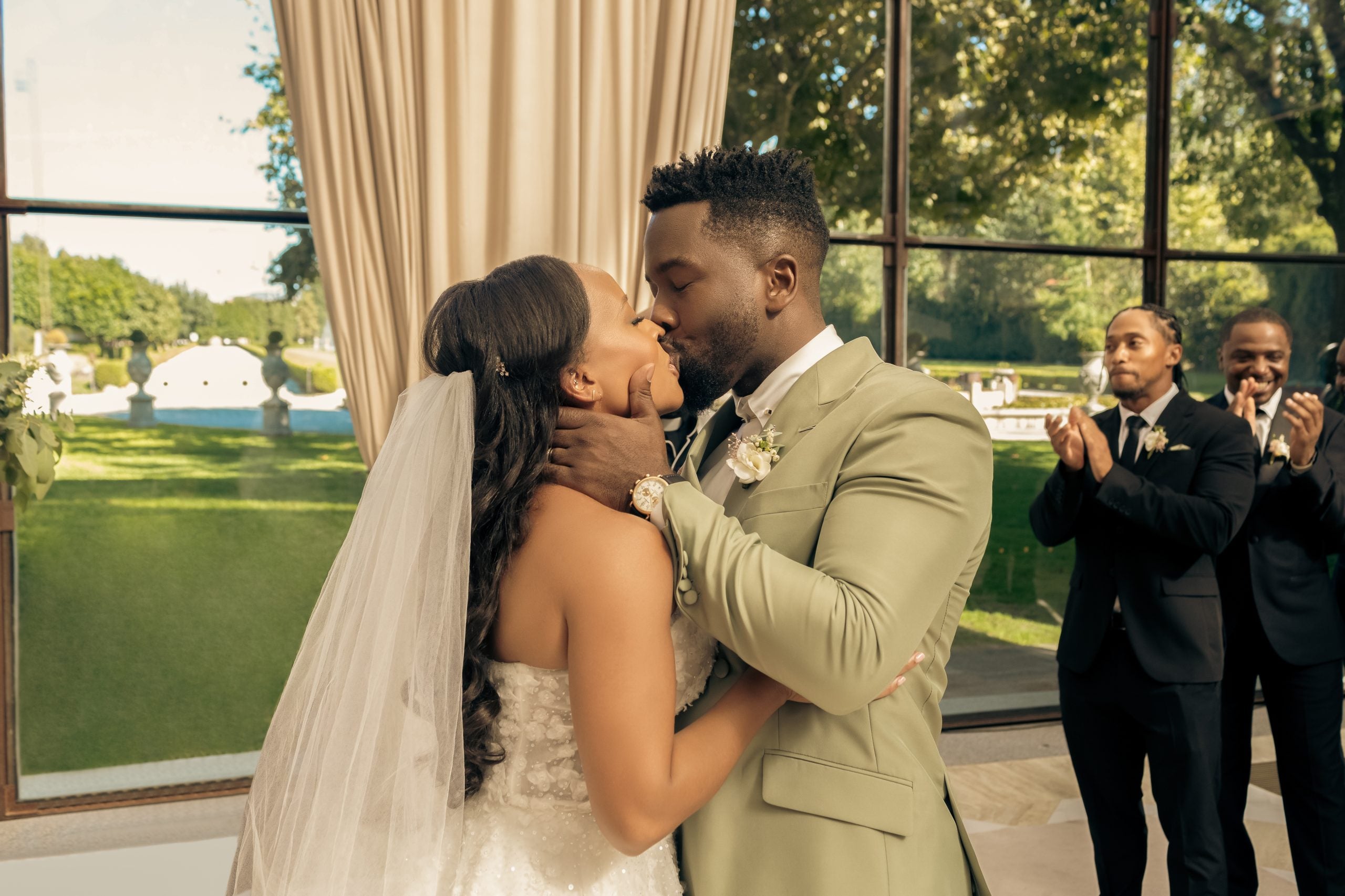 The couple share their first kiss as husband and wife, to the glee of their loved ones.