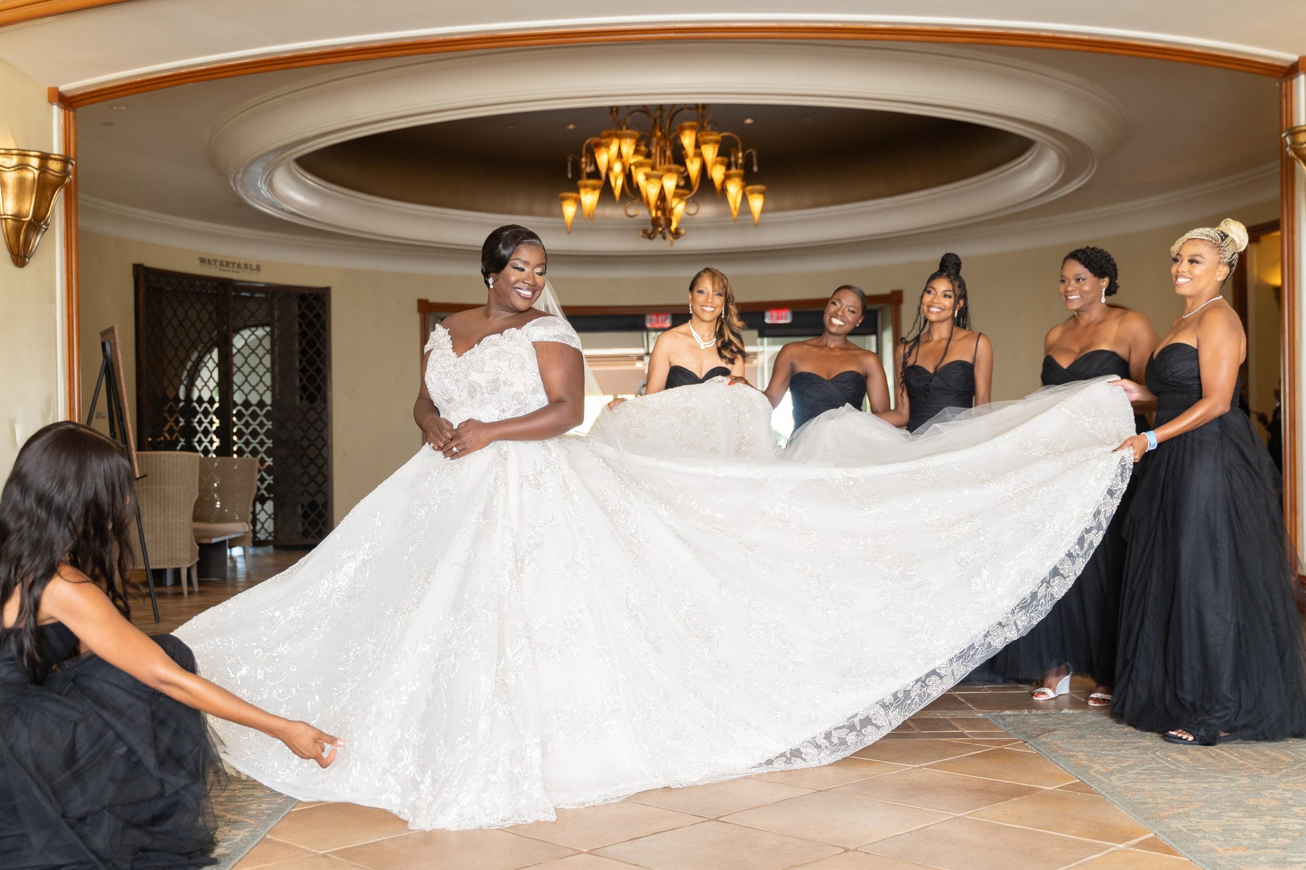 As the theme for the big day was vintage Black Hollywood, so was the theme for the bride’s look. The dress was custom made by Katerina Bocci. “She created an A-line, sweetheart off-the-shoulder corset gown with a back bustier, 3D hand-beaded flowers that adorned the sweetheart neckline with a 90-inch train, with cluster embroidery in silver lace on top of a soft nude underneath. And don’t get me started on that veil!” Kelley says. “It was a soft matching cathedral veil that was 13 feet long with a touch of matching lace appliqué. To me that dress screamed 1940s with a modern twist.”