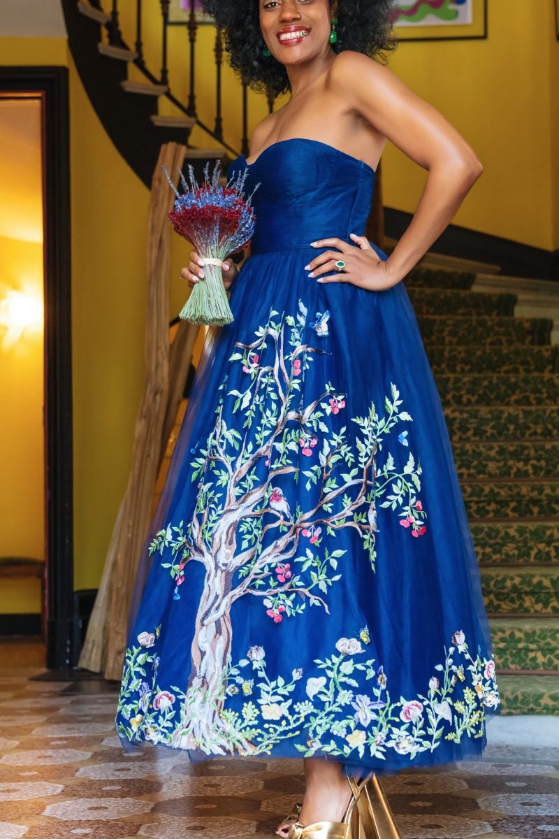“I happened to click on a website of a third-party seller and saw the dress that I wore for our France wedding and fell in love with it,” says Syreeta of the pricey piece. “I loved the idea of being the ‘something blue,’ instead of having something blue. So, I had the idea to go directly to the designer to see what they were selling it for and of course it was something like 25% cheaper. I immediately fell in love with MATSOUR’I’s designs, the whimsical uniqueness of each look really spoke to me.” MATSOUR’I, a Berlin-based fashion brand by Iona Matsour, is also responsible for the bride’s beautiful courthouse dress.