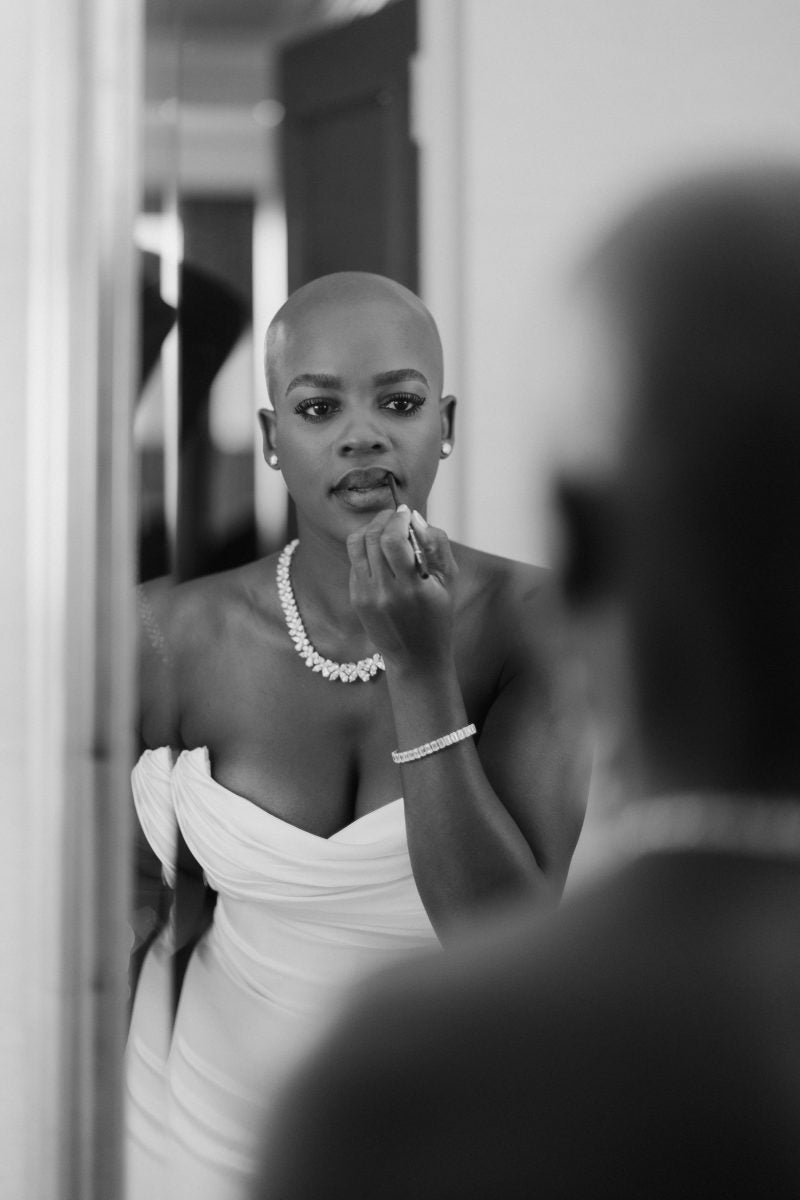 The pair are pictured on their way to enjoy their first dance. A fun fact about Lola’s look, the star MUA opted to have someone else, fellow makeup artist Tia Condrington, do her face for her special day. “Initially, I was going to do it but my planner convinced me otherwise,” she says. “My husband loves my natural beauty so I knew I didn’t want to deviate from the makeup I typically wear which is clean with a bold lip. My wedding dress was very simple and classic so I knew I wanted to wear my signature red lip. However, I’m very particular about my lashes and lips. Therefore, although my friend did my makeup, I applied my own mascara and lipstick as my own final touch.”