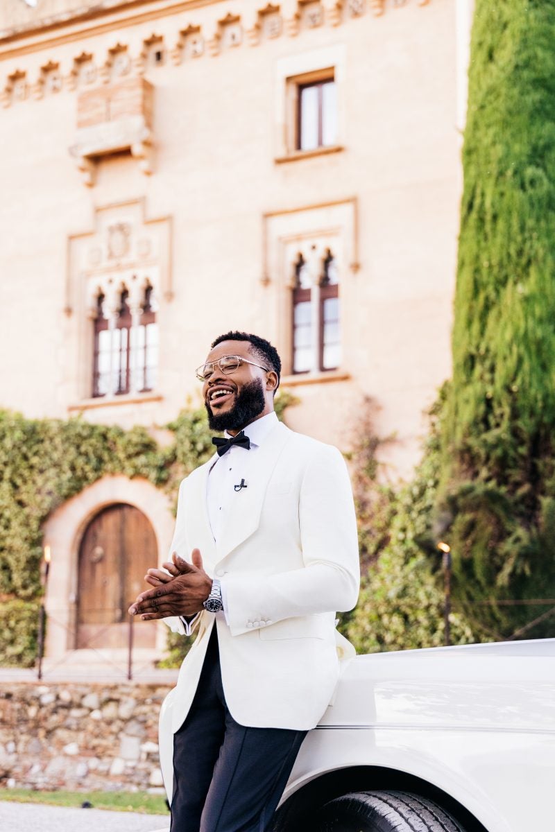 “Khris designed and created my silver after-party dress, inspired by Tina Turner,” says Ozioma. “It embodied a carefree, celebratory vibe as the wedding came to an end.” Obi was in another look by Uomo Migliore, whom he lauds for creating elegant, charming and fashion-forward looks that felt in step with Barcelona style.