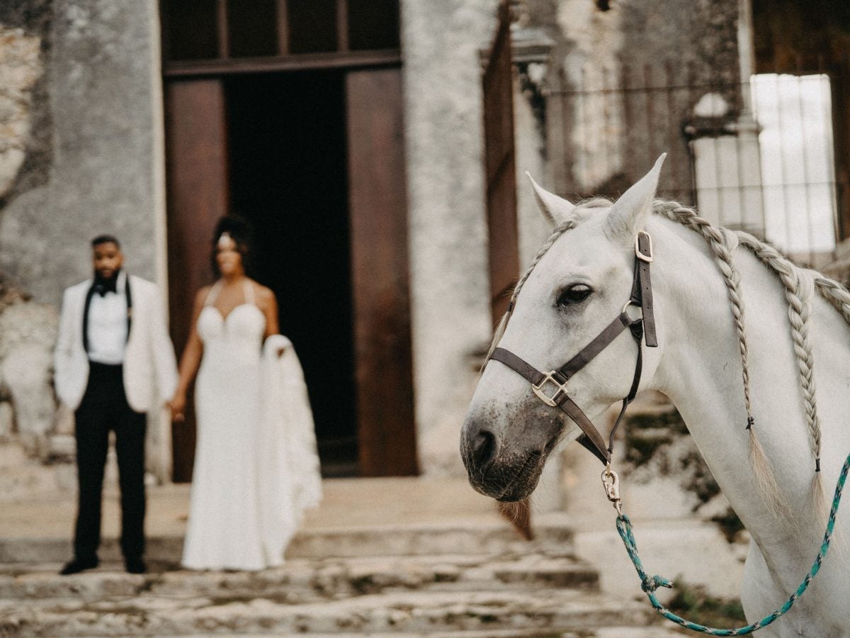 A majestic white horse was on hand for the couple’s photo shoot at their venue, Hacienda Yaxacopil. The horse’s mane was braided and he (or she) was ready to shine alongside the bride and groom.