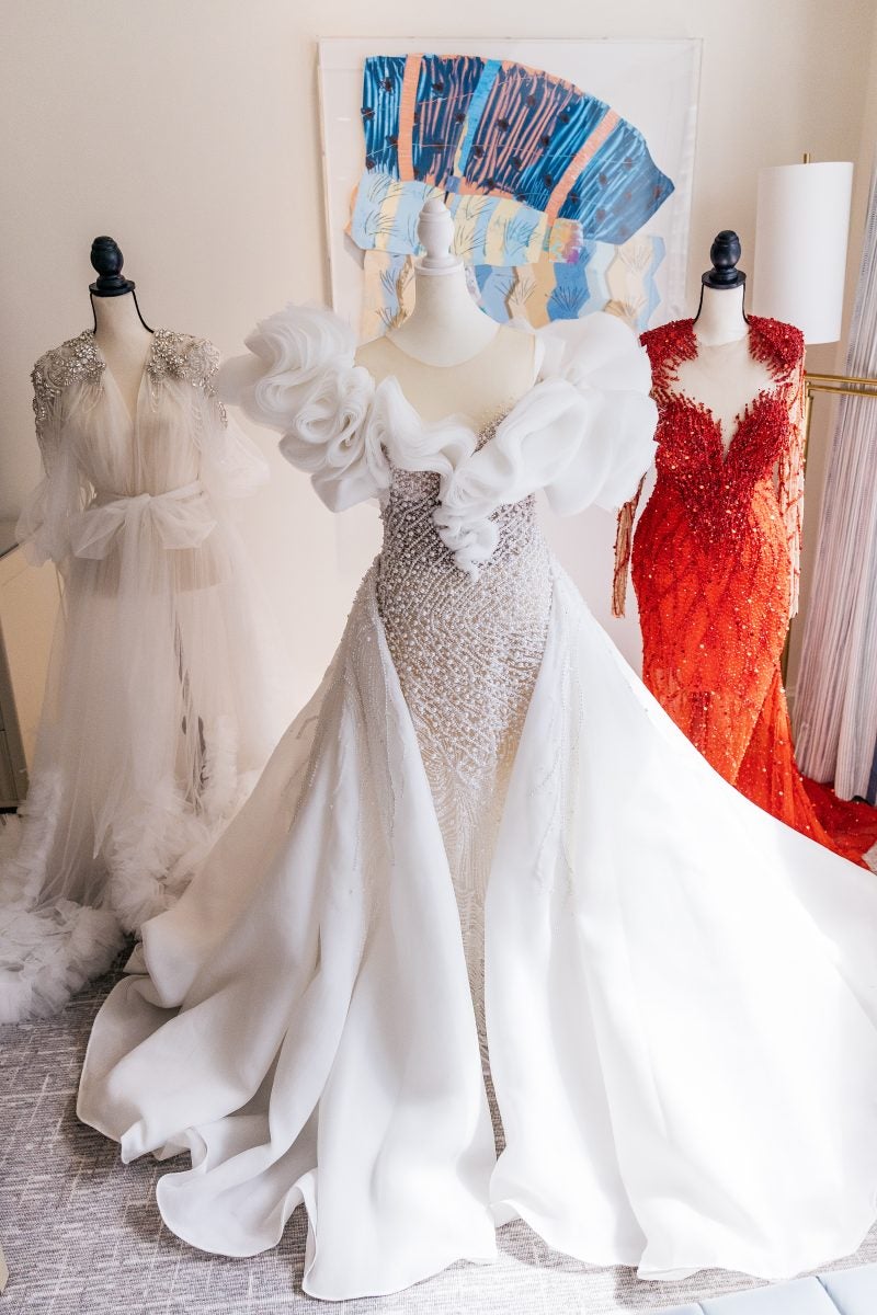 A shot of Shanice’s pre-wedding robe, along with her bridal gown (front and center) and her red hot reception dress. Once the celebration began, she wore three different outfits, including a show-stopping look (not pictured) to perform for her new hubby. More on that later!