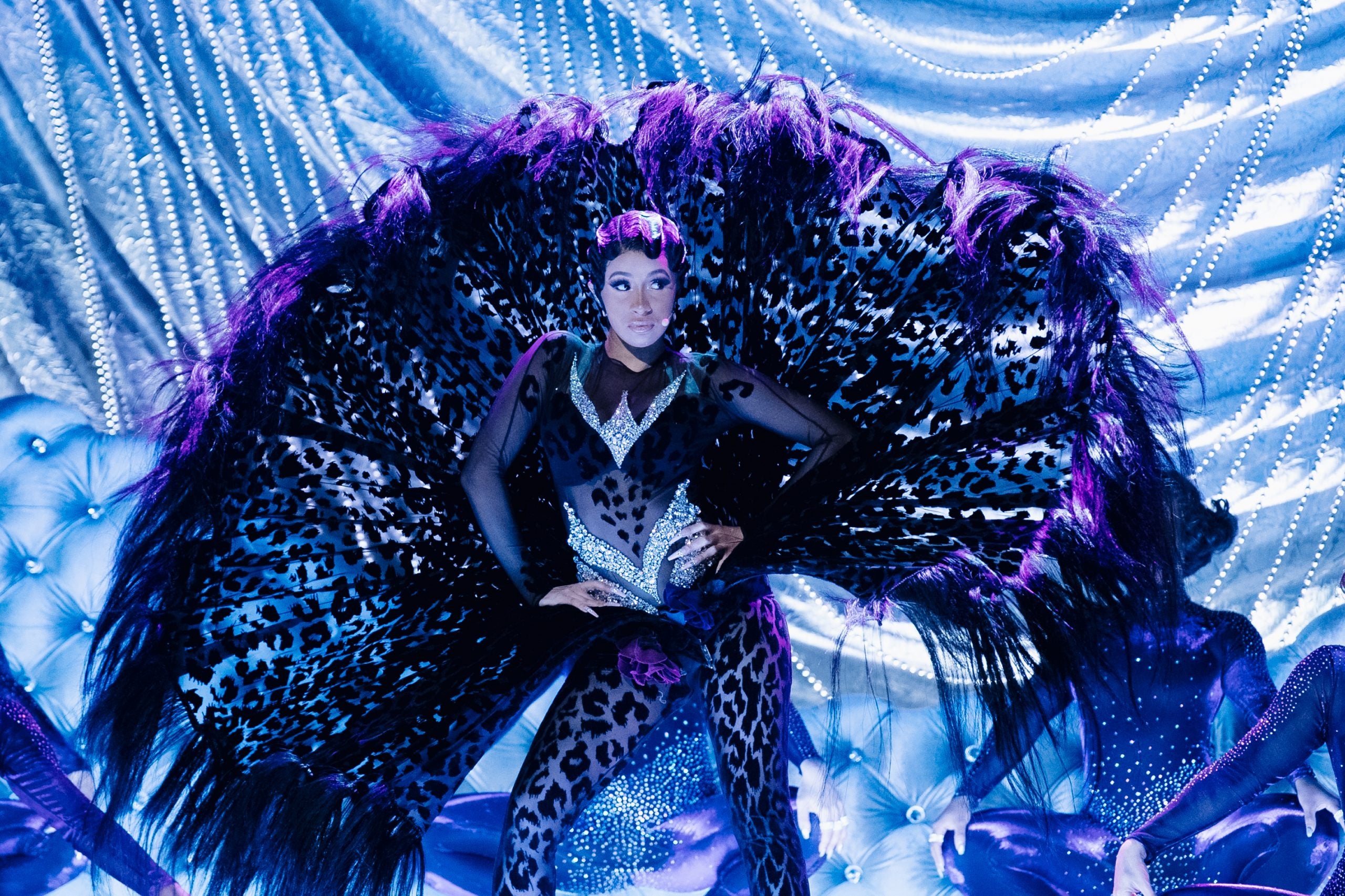 One of Cardi B’s unforgettable moments in Mugler was at the 2019 Grammy Awards when she graced the red carpet in a vintage baby pink and black peacock couture gown by the brand. This breathtaking ensemble featured a structured black velvet bodice and an extravagant shell-like skirt with a thigh-high slit. The look was a tribute to Thierry Mugler’sfuturistic designs from the ’90s. It perfectly captured Cardi’s fearless and extravagant fashion persona. She wore another Mugler piece in a similar silhouette with black lacing and lots of feathers for her performance on stage later that same night.