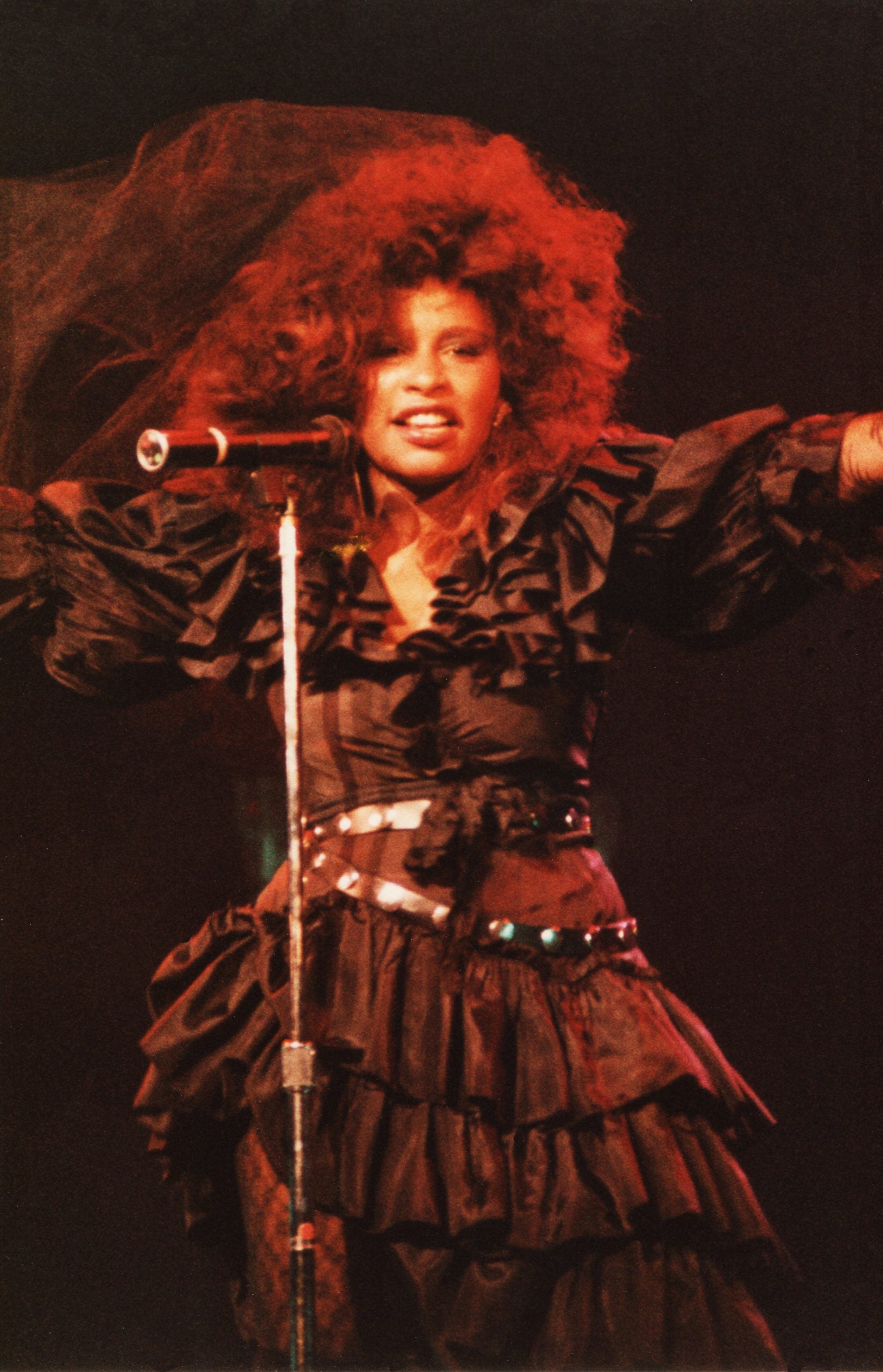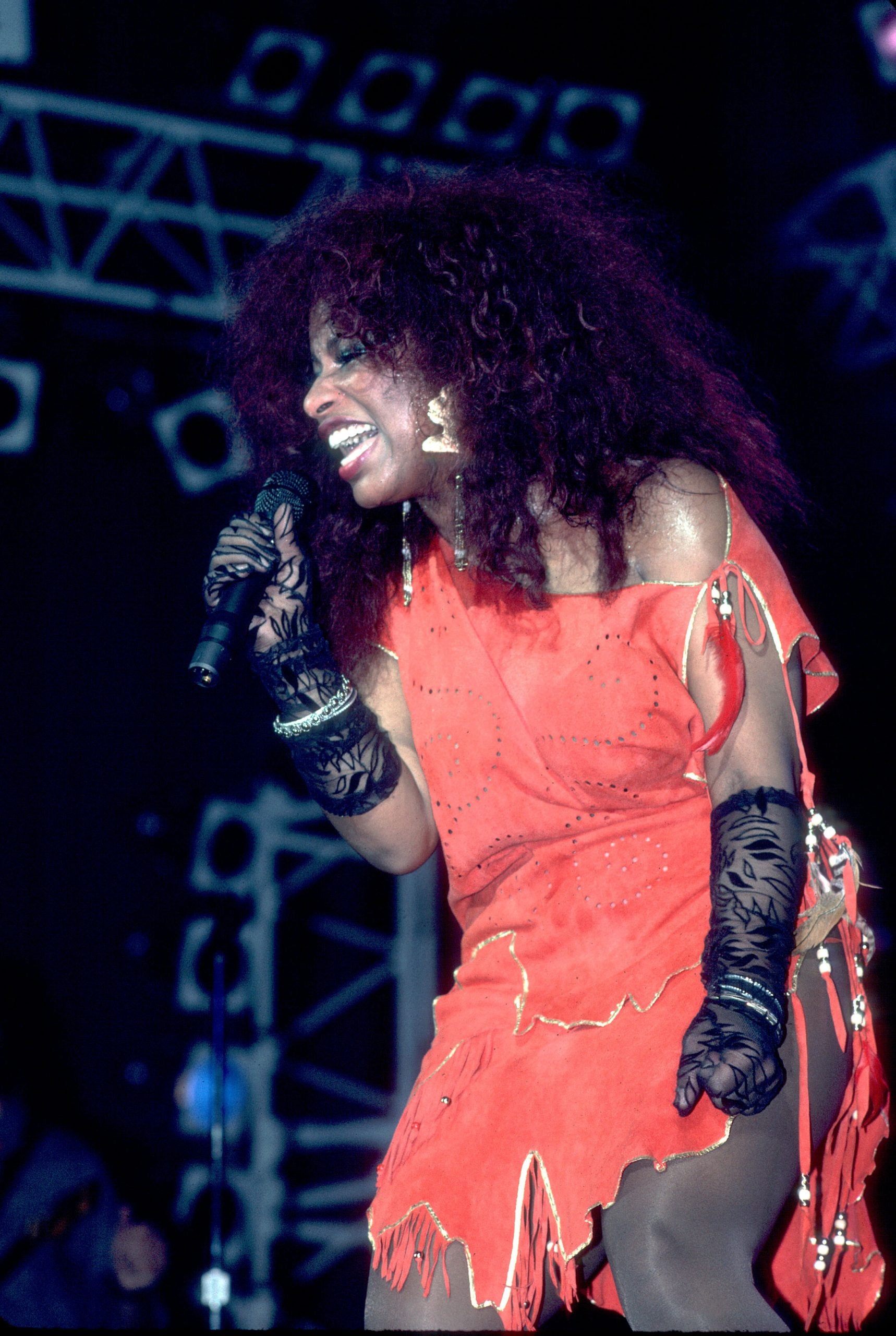 LONDON, UNITED KINGDOM – JANUARY 28: Chaka Khan performs on stage at Hammersmith Odeon on January 28th, 1985 in London, England, United Kingdom. (Photo by Pete Still/Redferns)