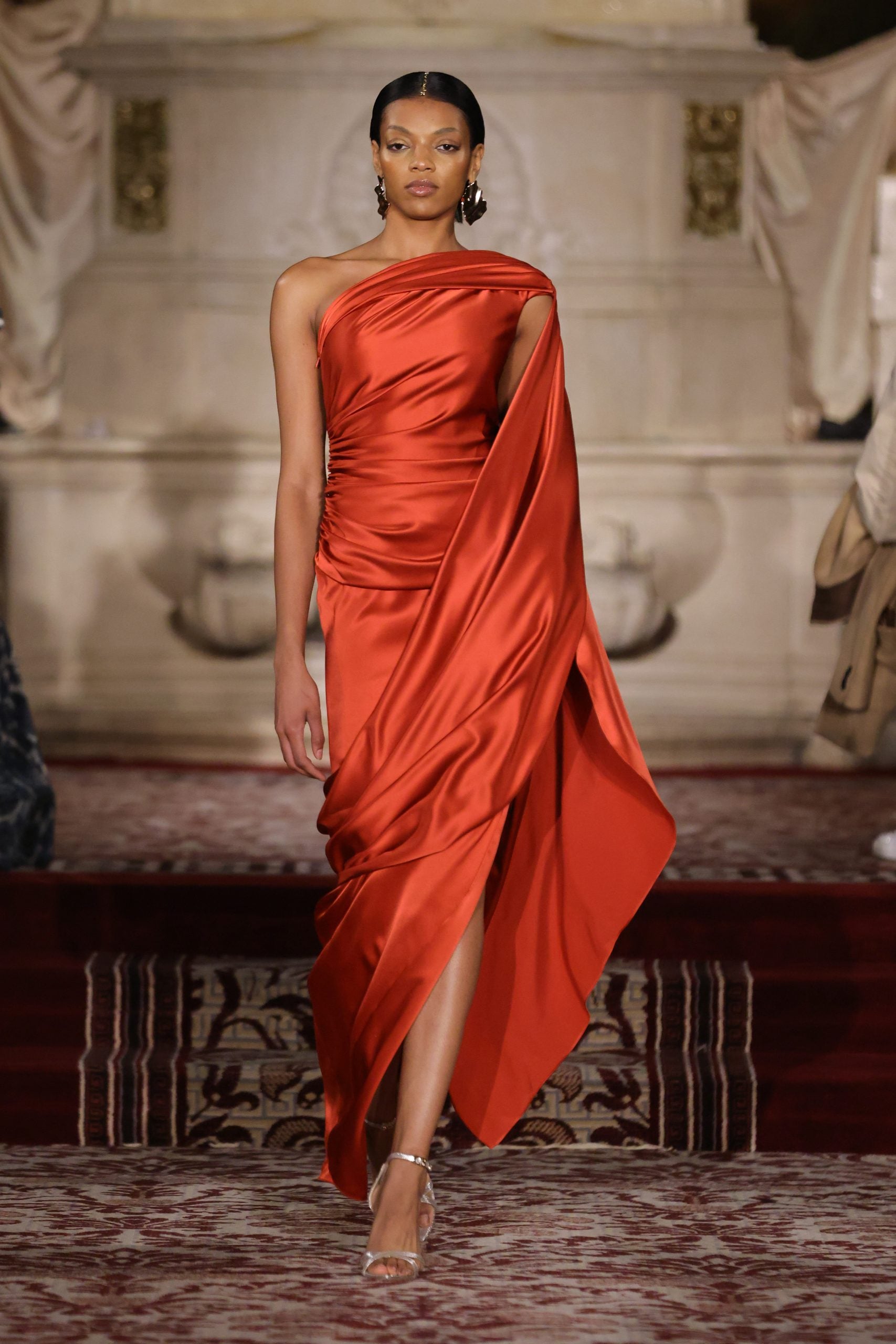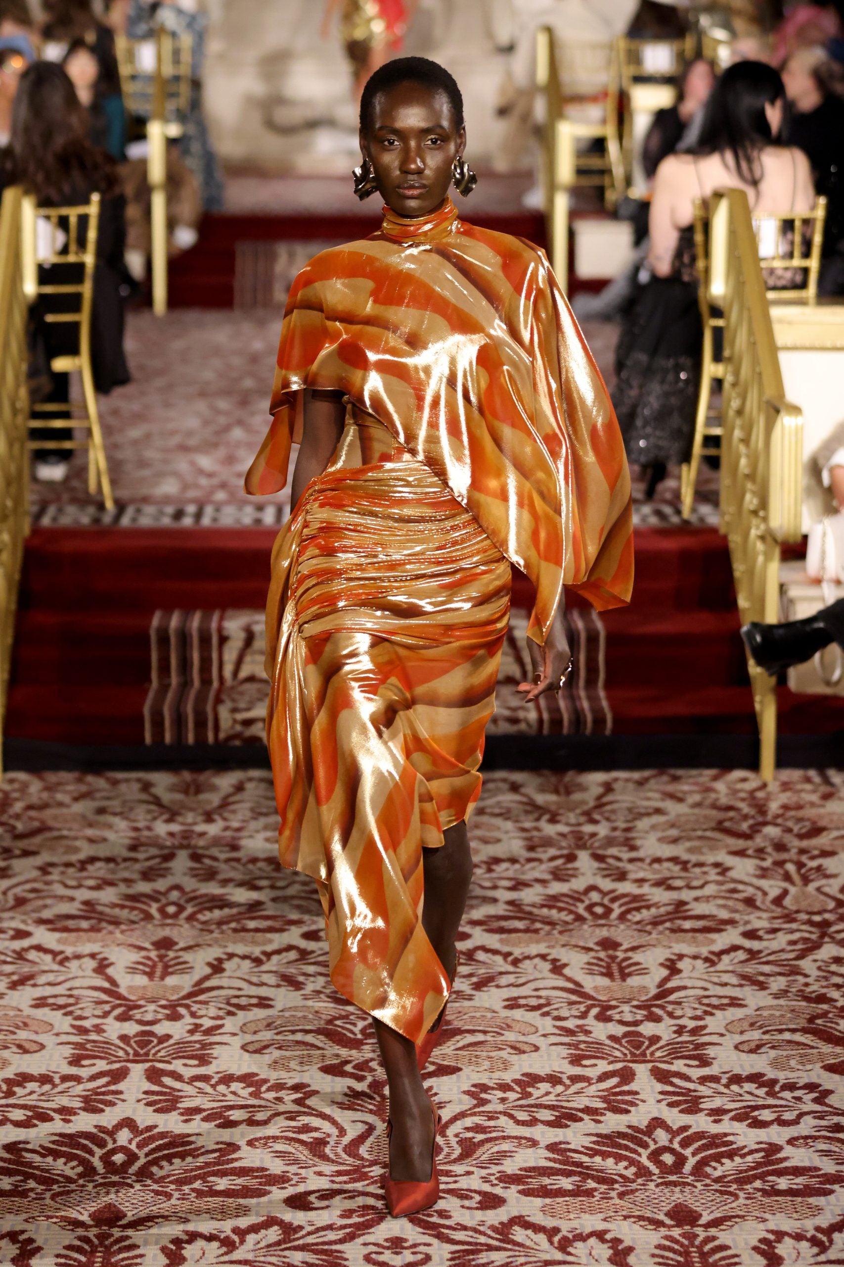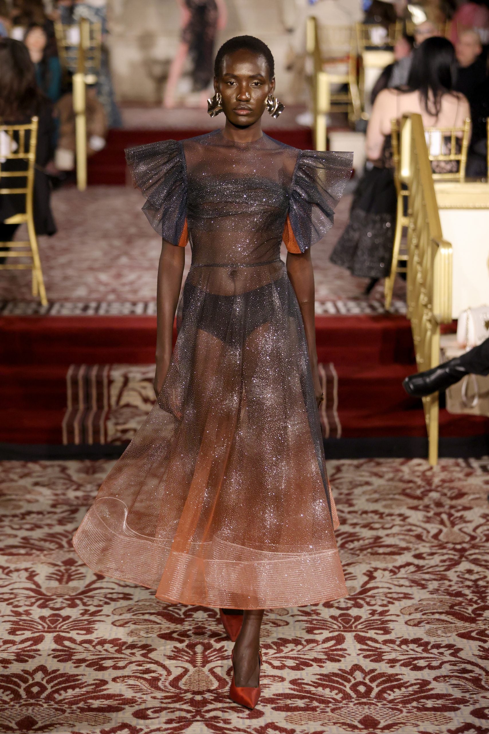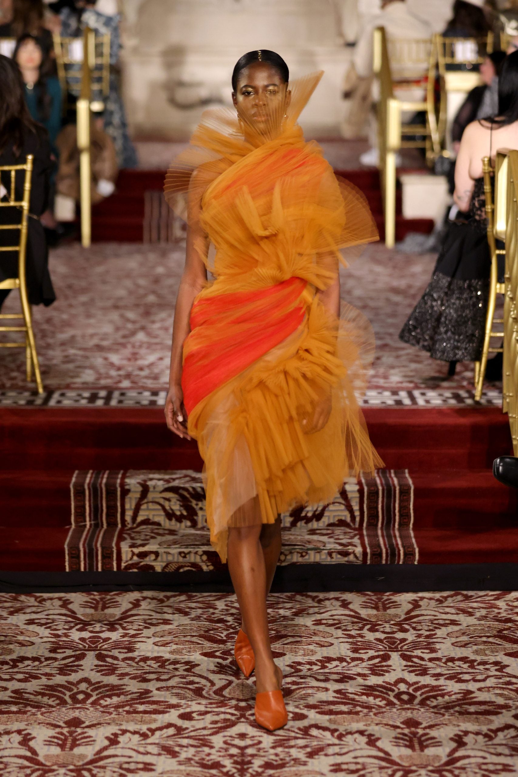 This season, Christian Siriano delved into what eveningwear of the last days of the world could look like. Dune was an inspiration for the designer and his presentation at The Plaza Hotel felt intimate and mostly clear-eyed. This was seen in the fresh and persuasive pieces he created: extravagant tulle gowns, eccentric ball gowns made with cuts of translucent tulle, and lustrous silk blazer suits and dresses. The color palette Siriano selected felt handpicked to evoke clothing that brims with depth and also a sincere dedication to experimentation which was delightful to witness in person. Deep oranges, golden touches, and magnificent reds were the hues that the designer leaned on.