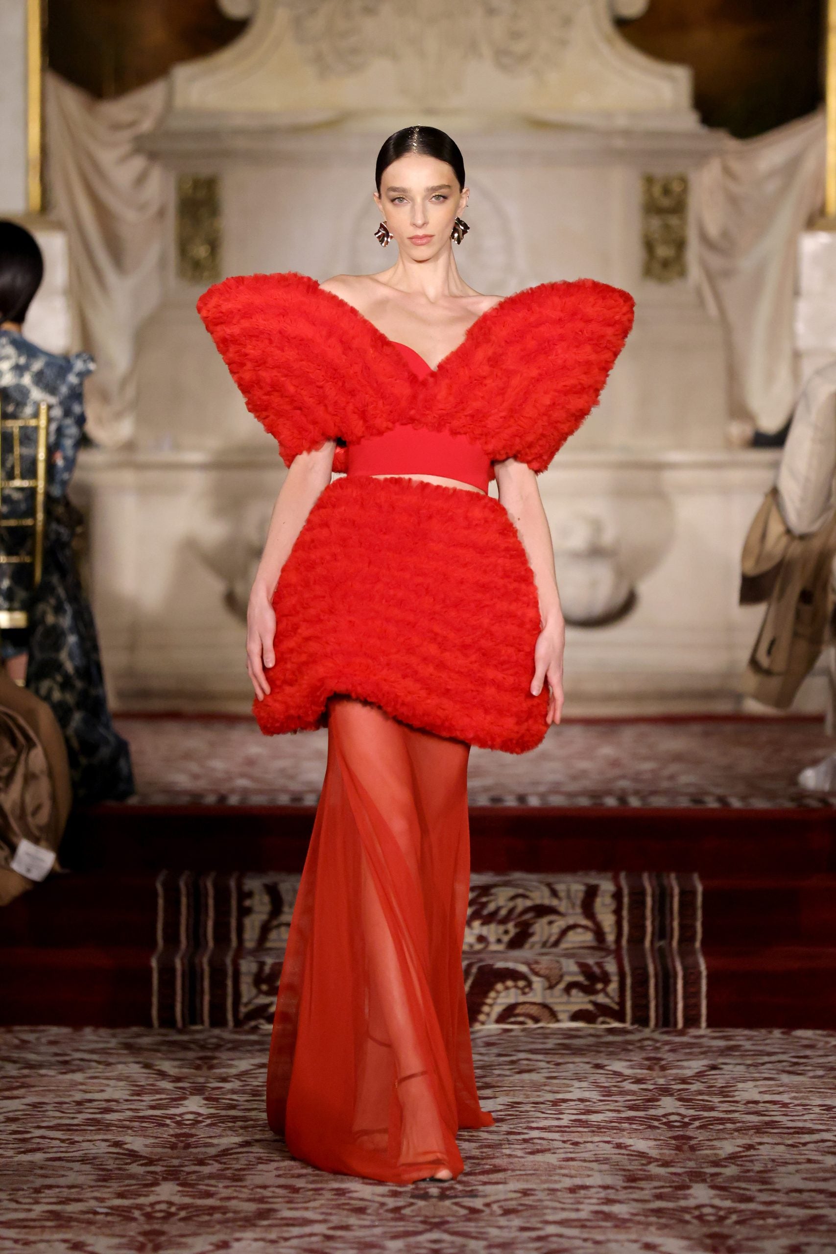 What was most interesting about the collection was how it appeared to also be an analysis of what is acceptable as red carpet attire. Many of the pieces that went down the runway could serve as options for awards ceremonies that will take place in the coming months. For instance, there was a bright orange tulle number that was compelling. It was designed with a splash of red fabric across the front. It didn’t feel too serious, instead, it felt experimental. Elsewhere, another red carpet option that felt like something for Hollywood darlings: a bold red cropped top was paired elegantly with sheer detailing and the oversized skirt that completed this look was crafted with a cherry red Lurex fabric.