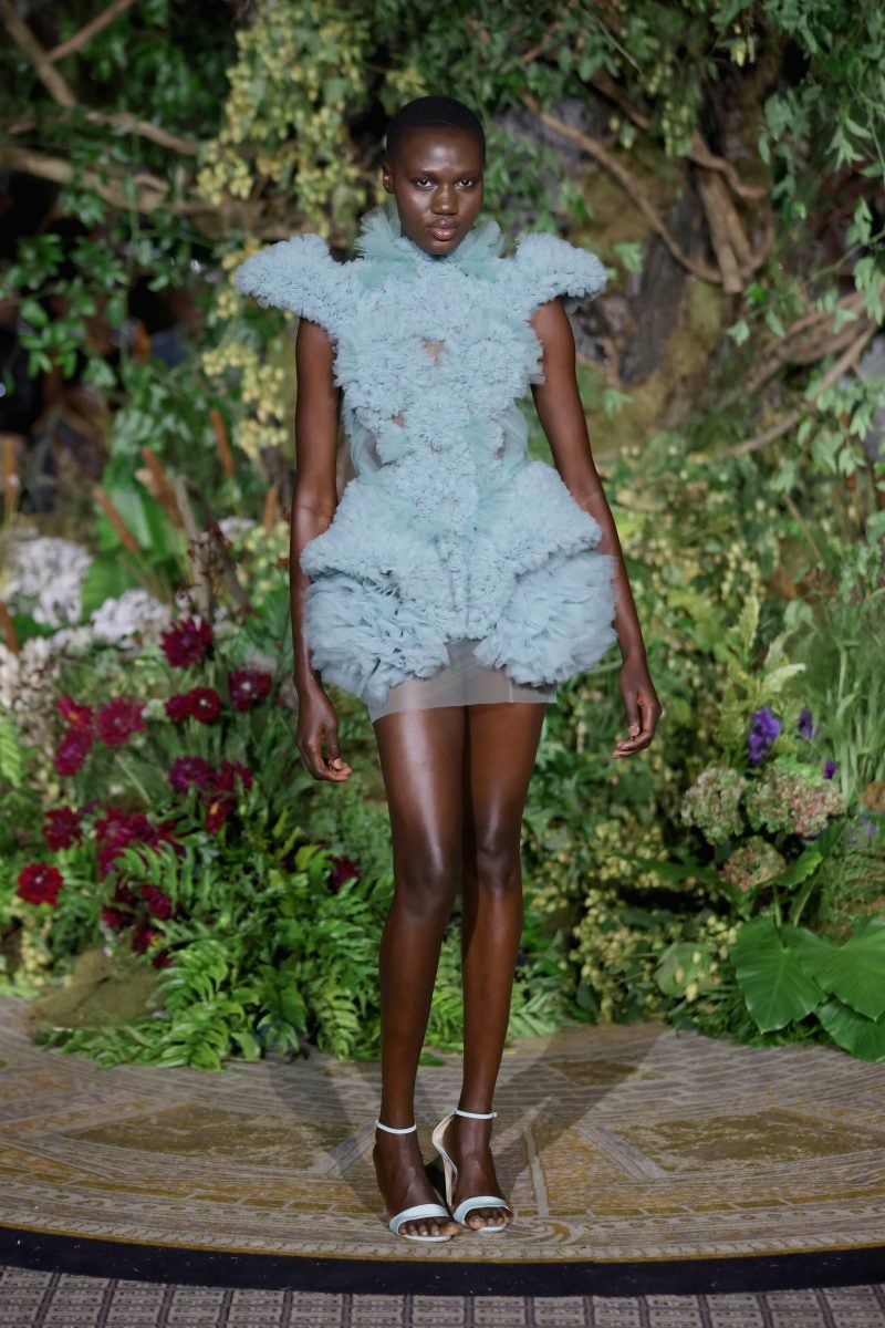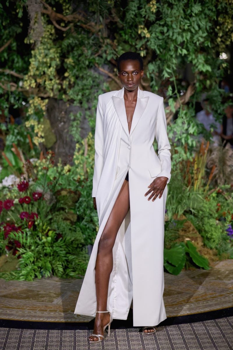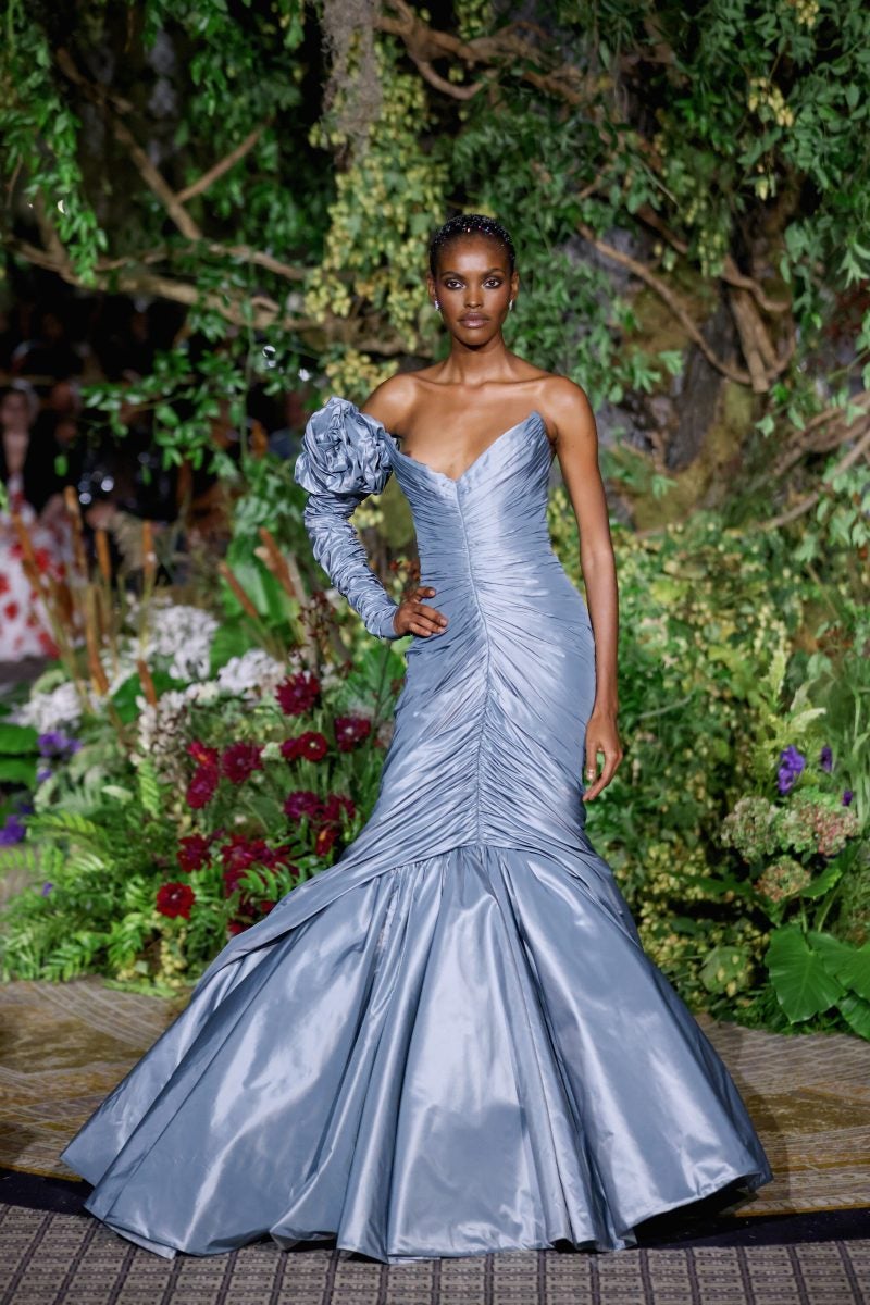 As showgoers watched the decadent designs they were also immersed in an enlarged magical leaning forest in the middle of the runway. Designs that are intrinsic to the bread and butter of the designer’s previous collections were prevalent: ballerina-inspired mini dresses and gowns with rows of tulle, and suiting with elegant proportions. Corsetry and shapewear also were taken for a spin by Siriano and so were gowns nearly made entirely of lace. “I really wanted this dark, Grimms’ Fairy Tales feeling,” Siriano told Vogue. “It’s a bit of a fairyland—but a dark fairyland.”