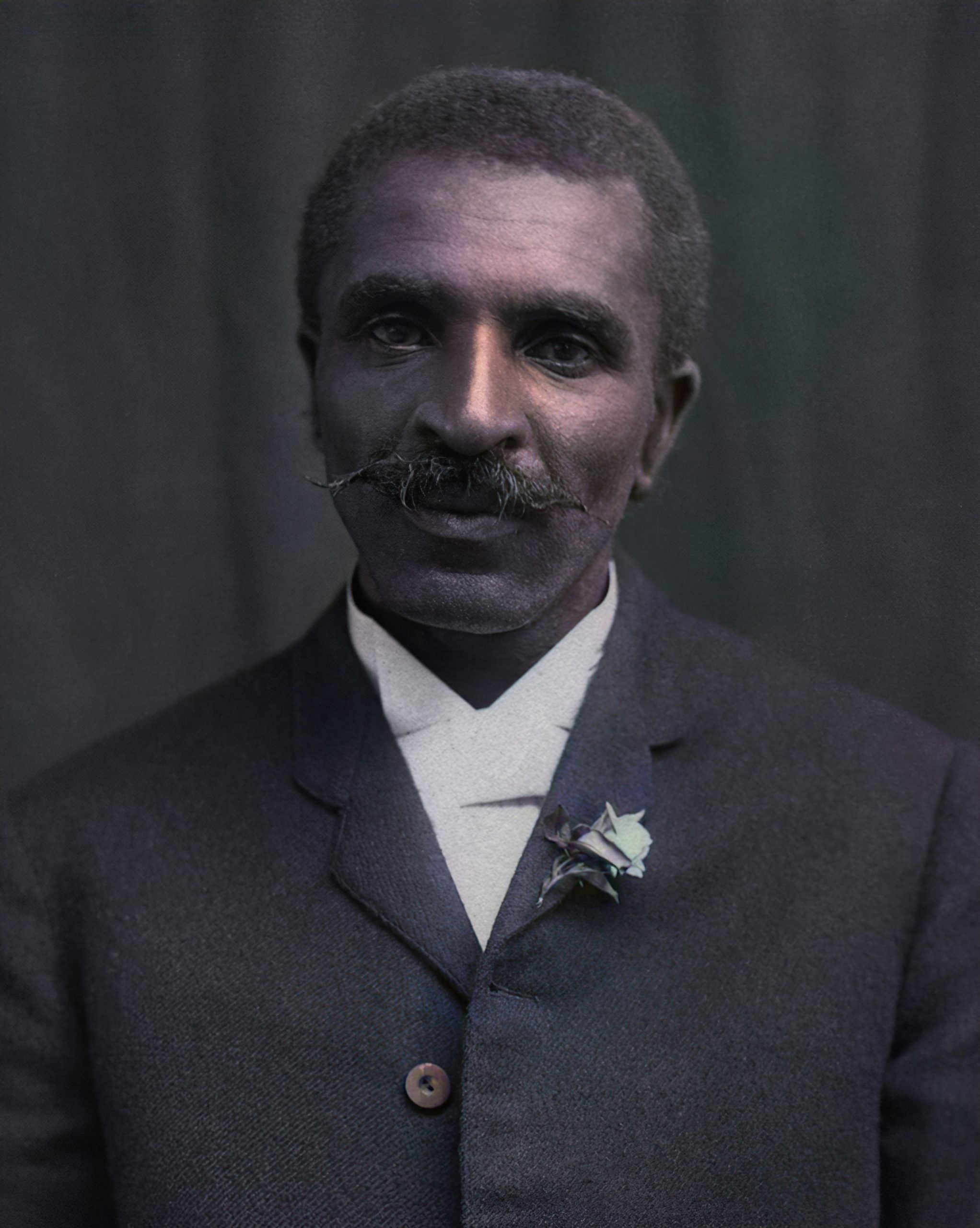 Colorized photograph of American scientist and inventor George Washington Carver, from the chest up, wearing a dark jacket and boutonniere and facing the camera with a relaxed expression, 1910. Note: Image has been digitally colorized using a modern process. Colors may not be period-accurate. (Photo by Gado/Getty Images)