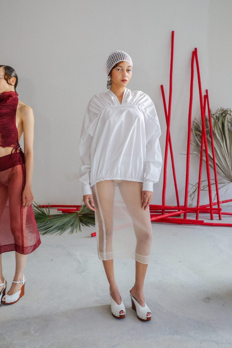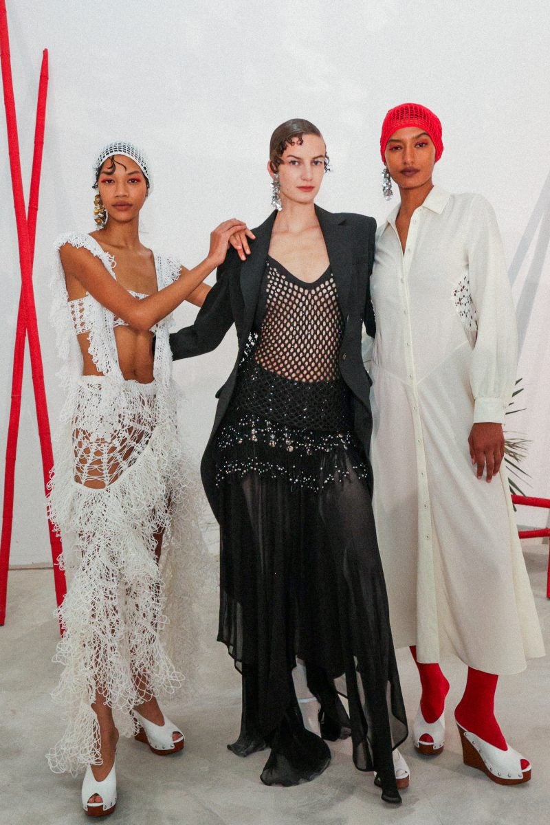 To put it plainly this is one of Scott’s most interesting collections yet. Not only is the presentation well attended, but the clothing is imaginative. The designer’s statement pieces within this line include a low-cut dress that appears to have seashells hand-stitched onto it. Another defining look? A white cropped top paired with an eccentric skirt crafted with rows and rows of dowry lace. This is similar to a previously released scallop crocheted dress and top that was designed in black and red—but this use of white feels abstract and special. These are also two terms that are interchangeable with Scott’s play on resortwear.