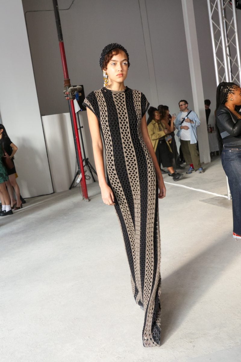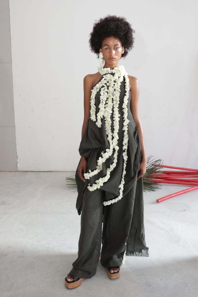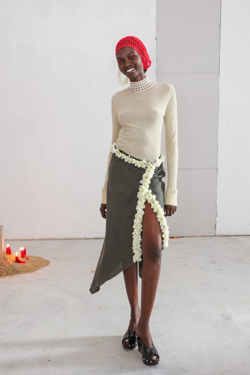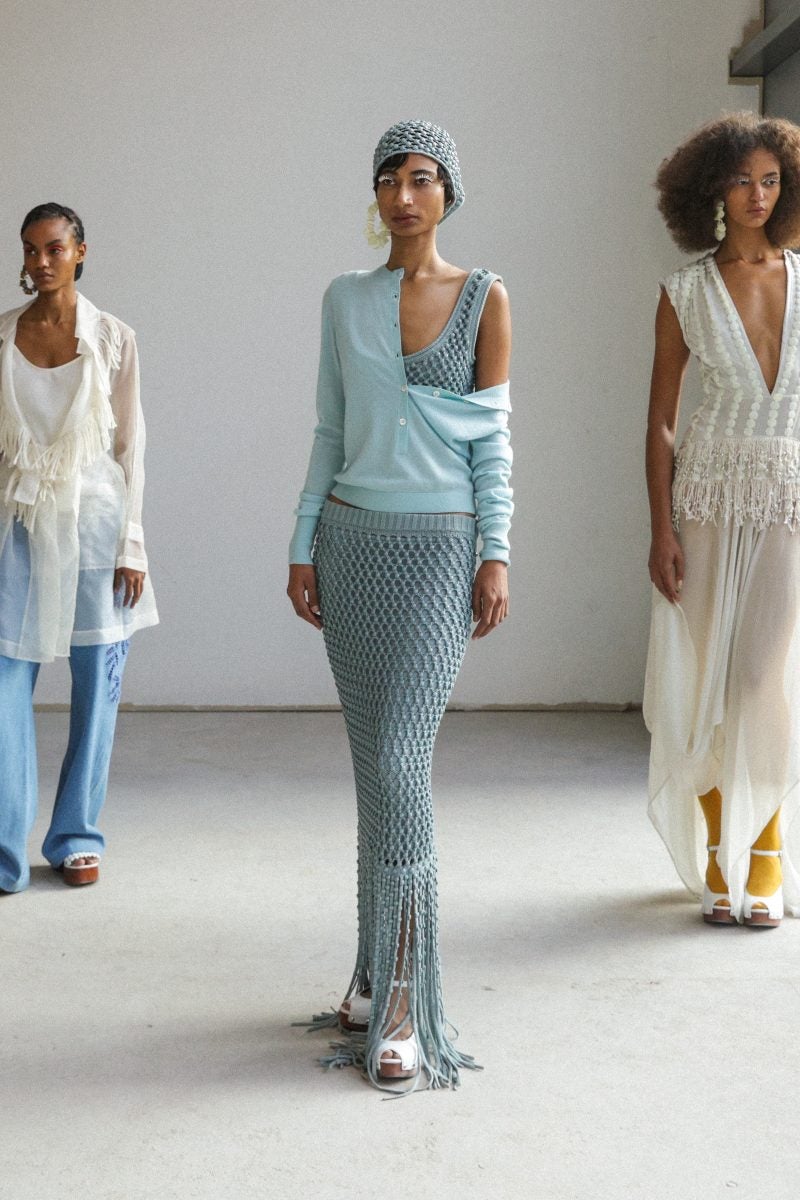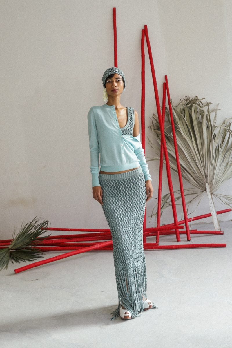 Low-cut backs and kitschy yet not corny pieces are seen within the line. The use of a baby blue hue is something that lands well—cream which has been used in the past is revived but given new life. This tone of blue is brought to fruition in the form of a cardigan worn with a knitted set consisting of a sleeveless tank and a skirt. A draped cotton jersey dress with a hit of grey also arrives in the previously mentioned tone. In the past, Scott has chosen to not plunge into using red matter-of-factly due to how largely it is associated with Jamaican culture. And yet, a silk red frock with cut-out floral designs makes the cut for Spring/Summer 2025.
