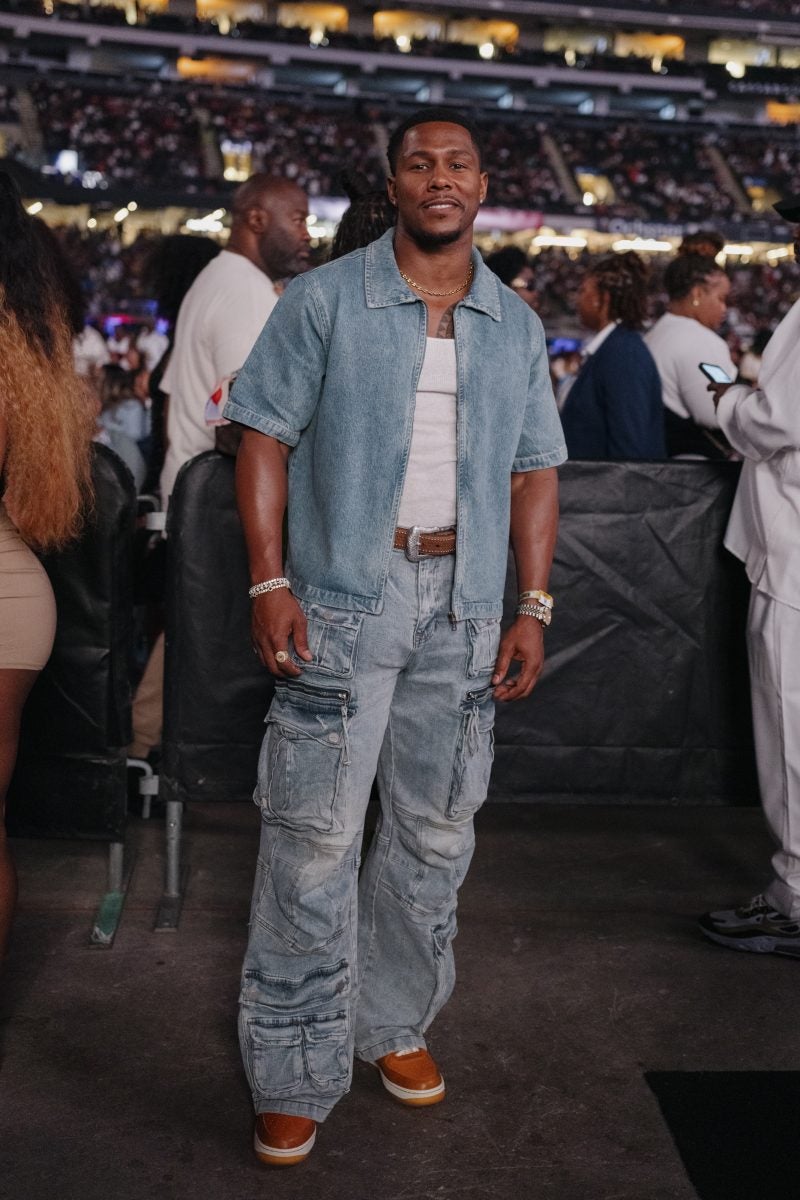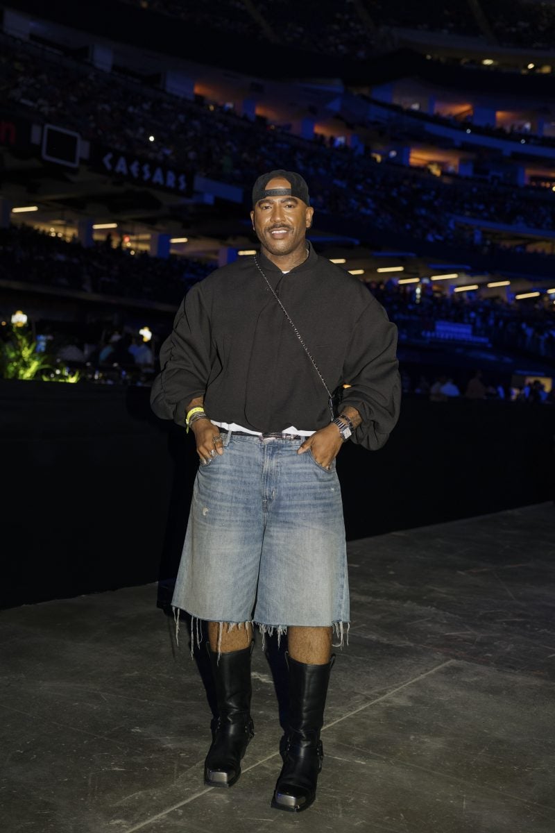 By the time the evening shows were set to begin, guests arrived at the Caesars Superdome in a myriad of outfits. For instance, a group of gentlemen wore matching pastel suits. Separately, punk inclinations also were seen on stylist Dex Robinson, who showed up in cut-off shants and goth-inspired boots. On another note, a stylish Canadian tuxedo was also spotted on one guest. An additional standout look in the evening consisted of a see-through dress with detailed beading just at the top. Another? A Victorian-inspired bustier dress paired with a pair of ruched denim and a bandana. This texture play was arguably one of my favorite looks from yesterday.