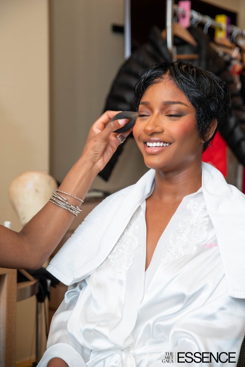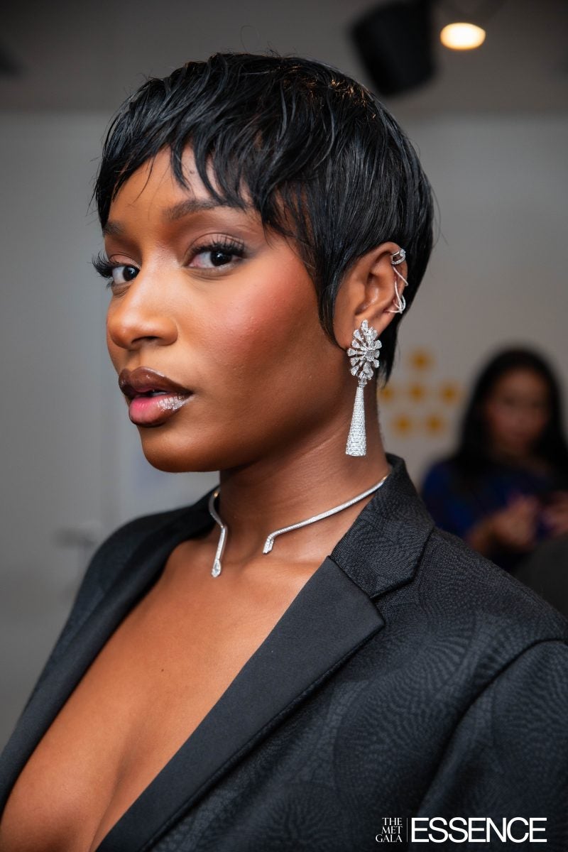 A proud June baby, Starr wanted to showcase her blue birthstone throughout the look, from her gemstone jewelry to her sharp, long nails. “The long nails stand for expressionism, confidence, and poise which are traits synonymous with Black style,” said Starr. The energy she aimed to exude on fashion’s biggest night? Polished. There’s no better person to help Starr achieve her goal than Boateng.