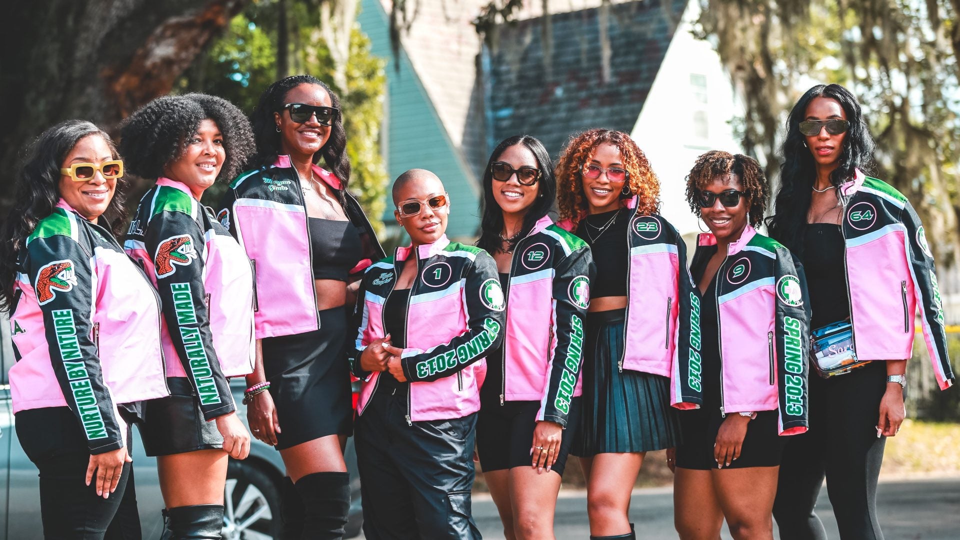 This set of friends and sorority sisters wearing matching custom jackets celebrating their Alpha Kappa Alpha anniversary with all-black outfits are a stylish bunch.