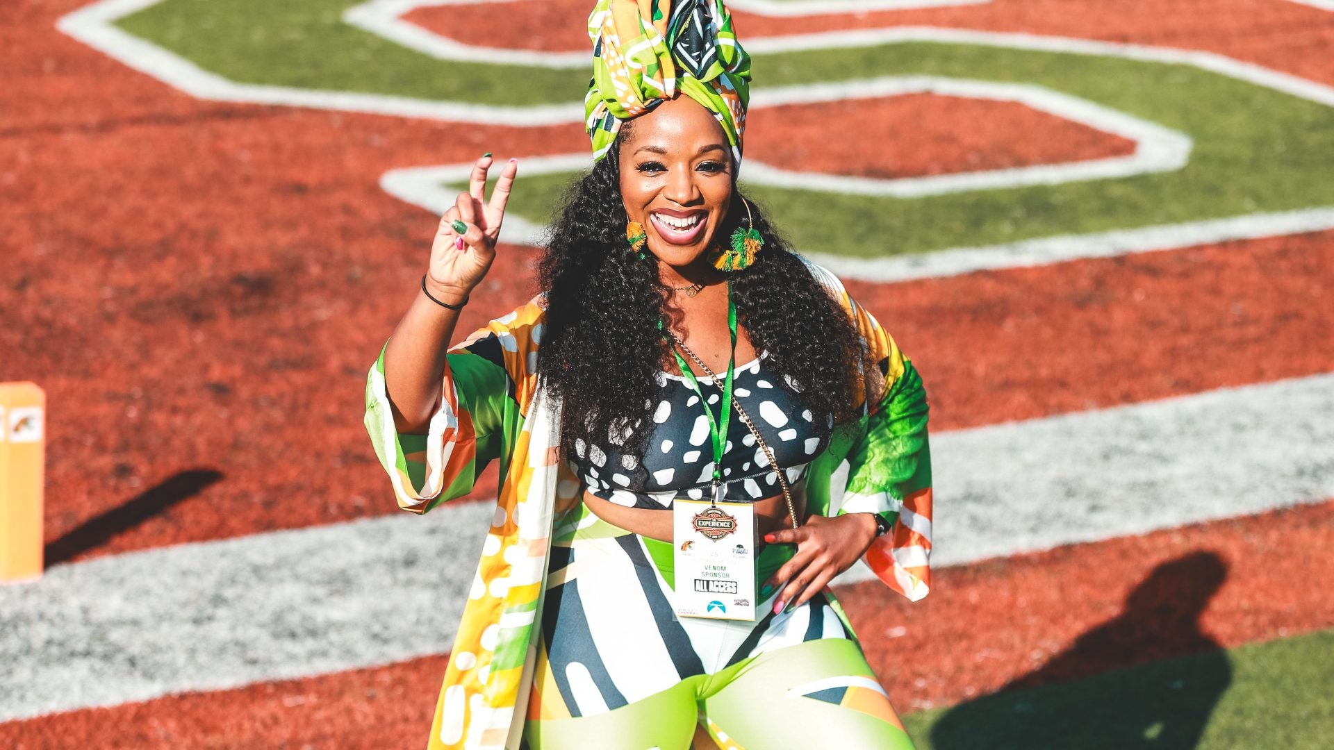 This magenta dress provides a hit of color for FAMU’s Vice President and Director of Athletics, Tiffani-Dawn Sykes who was working during the game.