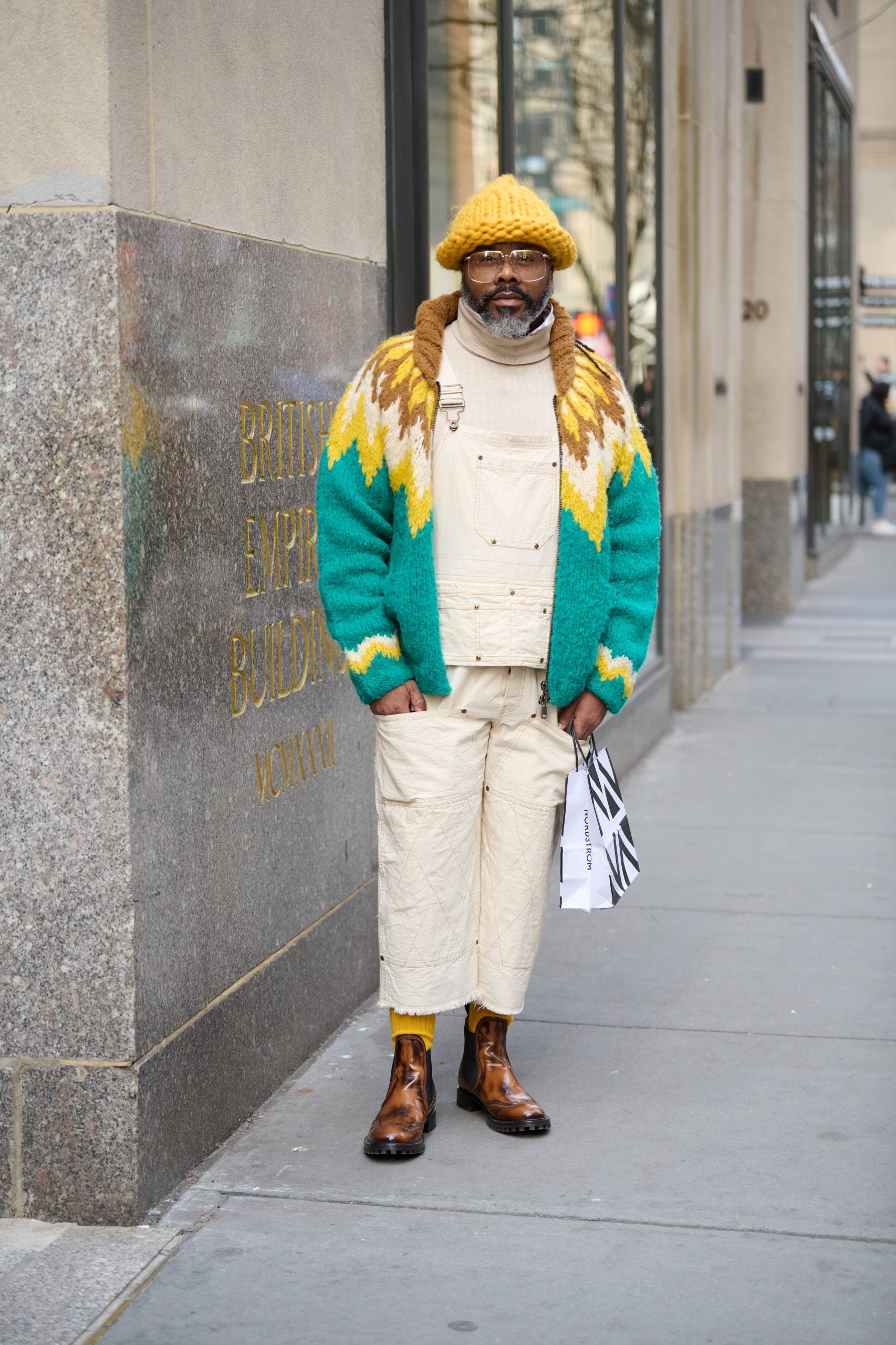 Selah Marley, daughter of Bob Marley was seen outside of the Collina Strada show in a whimsical ensemble of a knit hooded sweater dress with a mohawk detail in plaid and a fuzzy yellow bag for a pop of color. Model Aaron Rose Phillip was reporting for duty right before the show in a look made for a pop of red. Her hoodie and bag matched in red while her skirt was flowy, white, and satin paired with platform UGG boots. Singer Oyinda showed up in an all-black look, but it was not even close to boring. She added elements of texture like her fuzzy black shoes and played with proportions with her cropped zip-up hoodie and her flowing velvet pants.