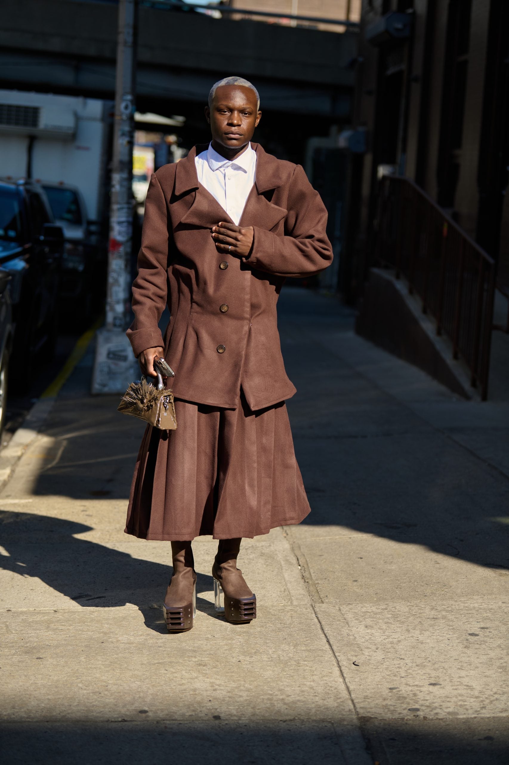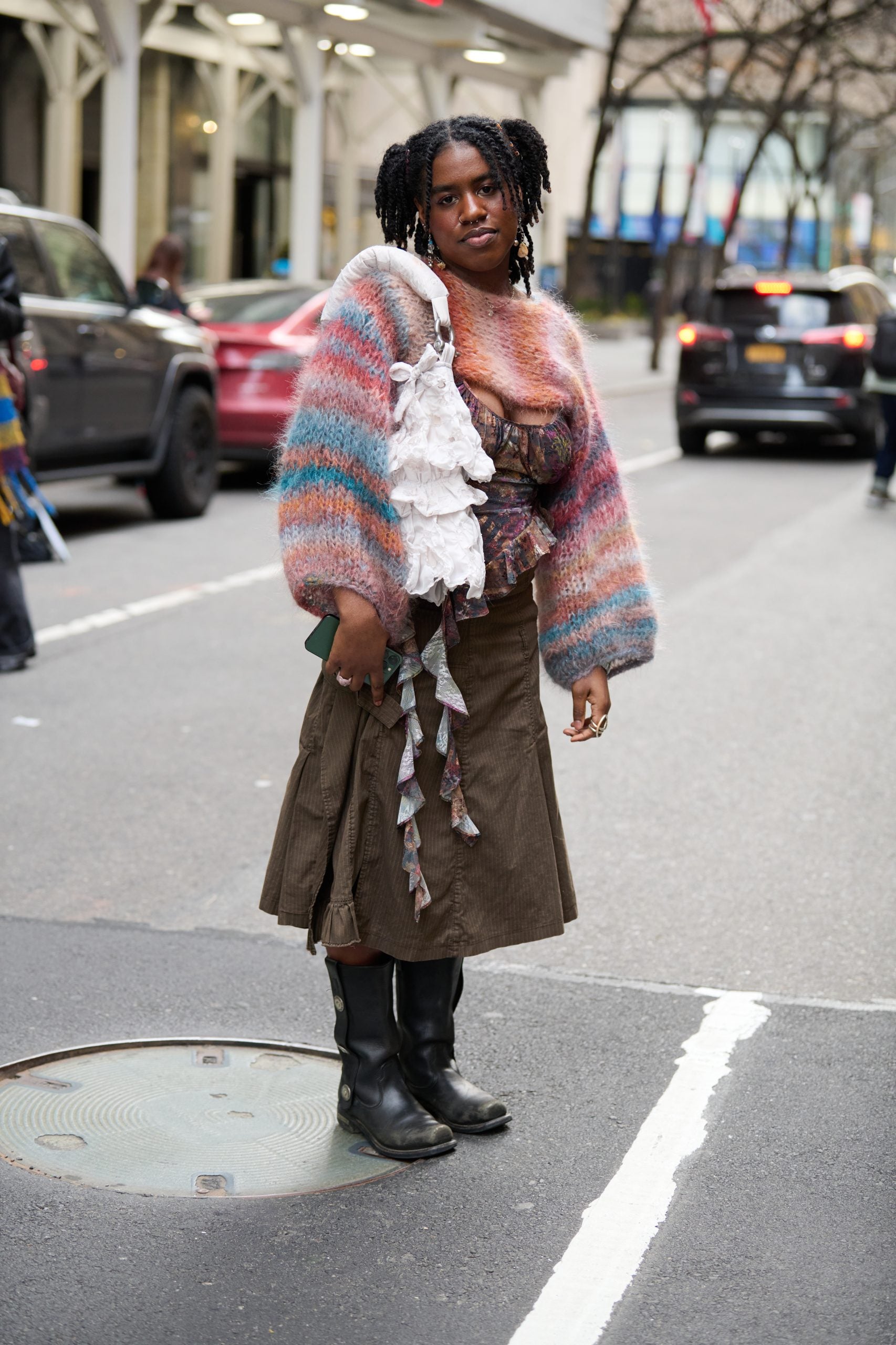 Fashion editor Naomi Elizee wore a Black-owned brand Dauan Jacari’s plaid boxer skirt and a graphic black T-shirt underneath a blazer and tied her look together with a pair of black boots with a grommet detailing. Model and artist Gabrielle Richardson came out to support Collina Strada in a hoodie and lace skirt by the brand in pastel pink colorways and paired brown leather boots that had a vintage feel to them to tie her outfit together. Telsha Anderson-Boone gave an A$AP Rocky-esque look in a long wool tan coat over a light wash denim-on-denim ensemble, a black Bottega bag, and a pair of black boots.