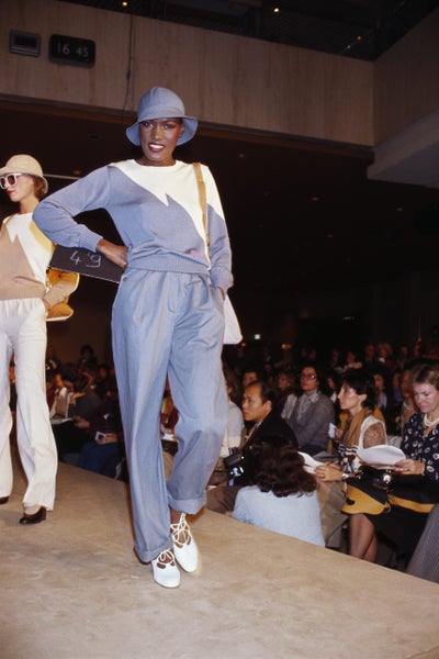 Fashion model Grace Jones wears ready-to-wear women’s fashions by French designer Emmanuelle Khanh for her French fashion house during a 1976-1977 Fall-Winter fashion show in Paris. Jones wears a light blue and white shirt, light blue pants, and a light, blue, brimmed hat. (Photo by Pierre Vauthey/Sygma/Sygma via Getty Images)