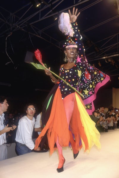 Fashion model and entertainer Grace Jones wearing a brightly colored ready-to-wear costume decorated with a cape, sashes, and a tall hat by American fashion designer Patrick Kelly. She is modeling the outfit during his Spring-Summer 1989 fashion show in Paris. (Photo by Pierre Vauthey/Sygma/Sygma via Getty Images)