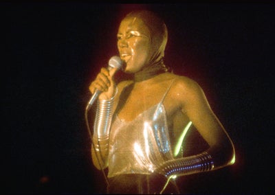 Singer and model Grace Jones performs at La Mouche Disco in New York City on September 23, 1977. (Photo by Ron Galella/Ron Galella Collection via Getty Images)