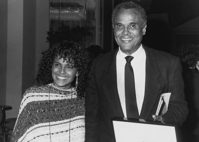 American singer and actress Shari Belafonte and her father, American singer and actor Harry Belafonte attend an unspecified awards gala, location unspecified, circa 1985. Harry received the Upton Sinclair humanities award at the ceremony. (Photo by Vinnie Zuffante/Michael Ochs Archives/Getty Images)
