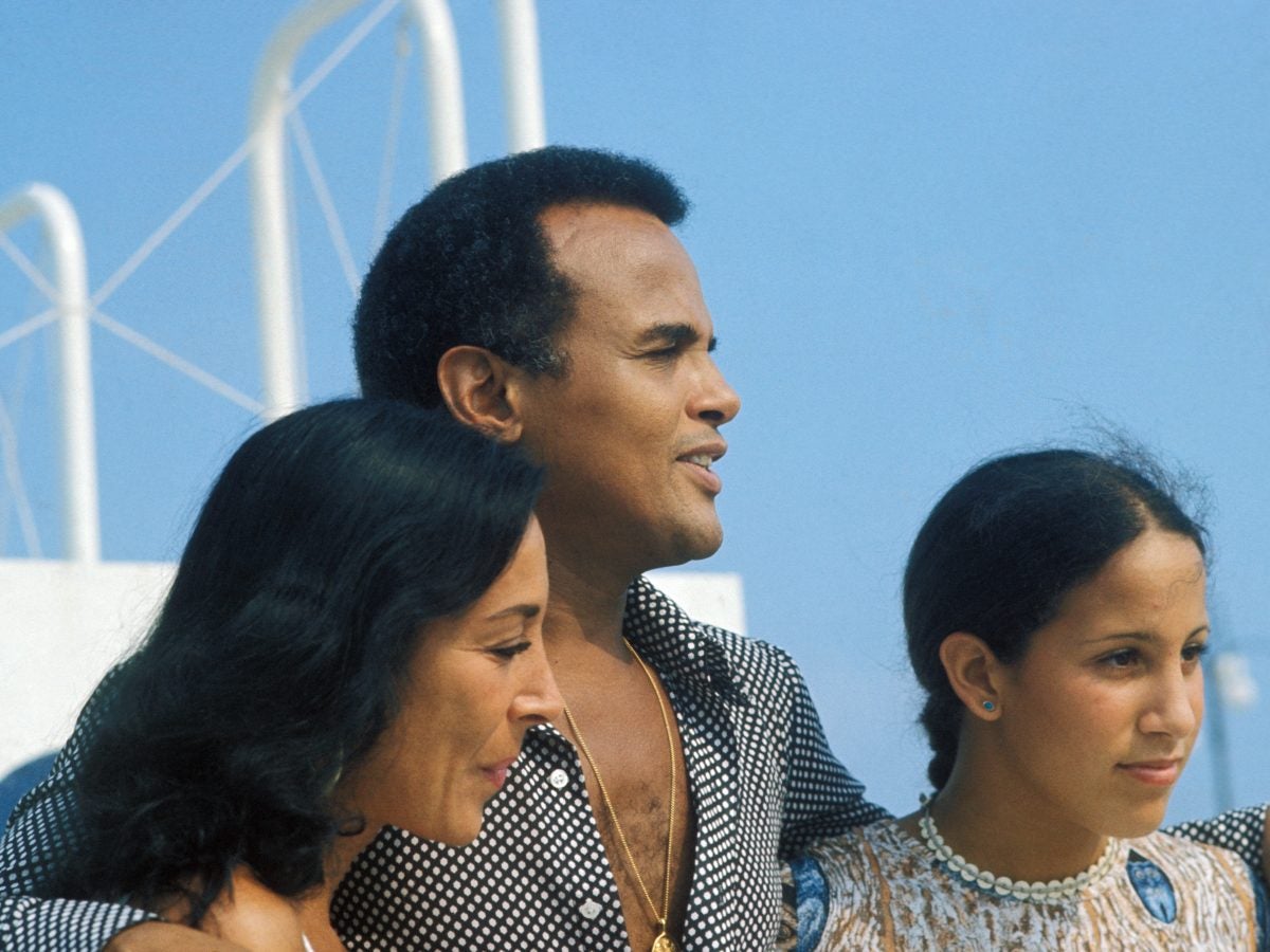 Le chanteur Harry Belafonte avec son épouse Julie et sa fille Gina le 25 juillet 1975 à Cannes, France. (Photo by Pool GINFRAY/MOUTIN/Gamma-Rapho via Getty Images)