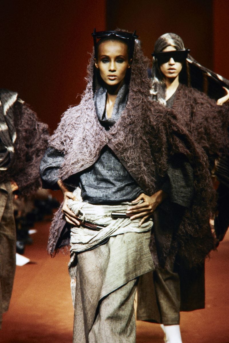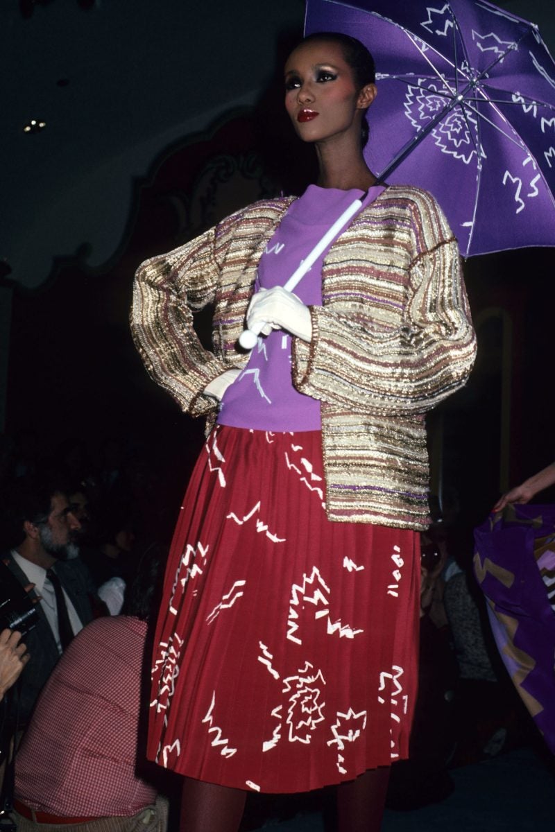 Model Iman walks in the Issey Miyake Spring 1984 Ready to Wear Runway Show on October 15, 1983, in Paris, France. (Photo by Guy Marineau/Penske Media via Getty Images)