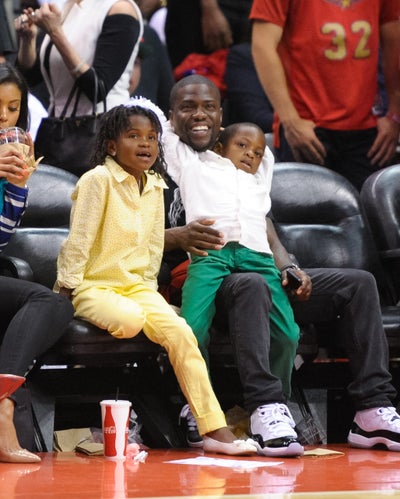 LOS ANGELES, CA – APRIL 22: Kevin Hart and his children Heaven (L) and Hendrix (R) attend a playoff basketball game between the Memphis Grizzlies and the Los Angeles Clippers at Staples Center on April 22, 2013 in Los Angeles, California. (Photo by Noel Vasquez/Getty Images)
