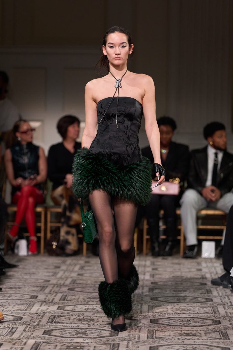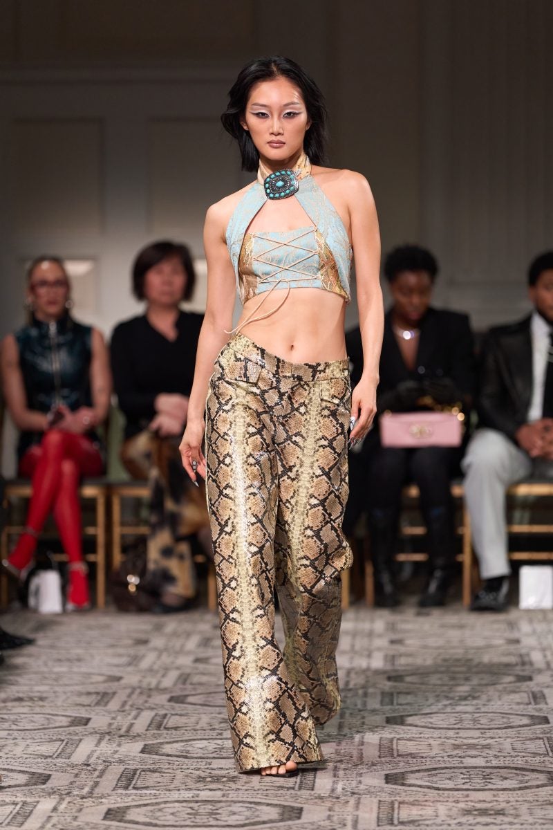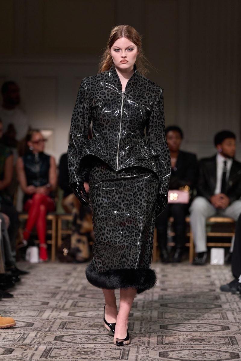 Immediately a theme of sensuality is present on the runway with models dressed in textured suiting, suit dresses, and matching power sets. These pieces are a subversive play on masculinity, creating a blank canvas for the body’s identity to be deconstructed and reconstructed all at once. Shui’s influence from artist Monica Bonvicini is seen on the runway in the form of her leather belts and handcuffs, a motif that fits into the brand universe with ease. Western wear and Chinese embroidery are prevalent in the collection with “K” adorned bolero ties around collared necks, fur trimmed jackets and cowboy shaped fur hats. Qipao collars adorn jackets and tops as a nod to Shui’s heritage while the serpentine shaped fur trims of two snakes embracing symbolize renewal, as it’s the year of the snake. Speaking of, snake print is utilized in a way that isn’t on-the-nose on the structured pants and a strapless leather dress.