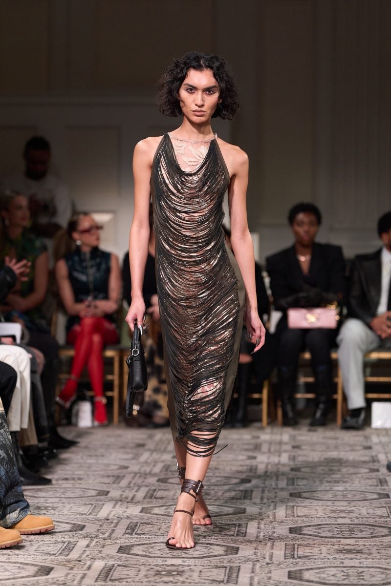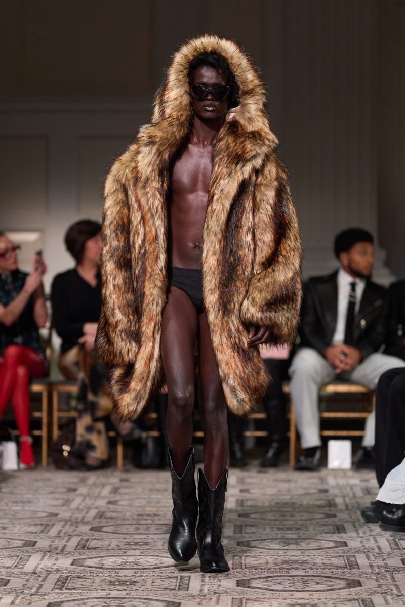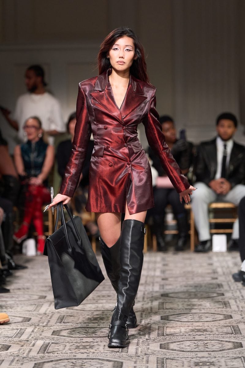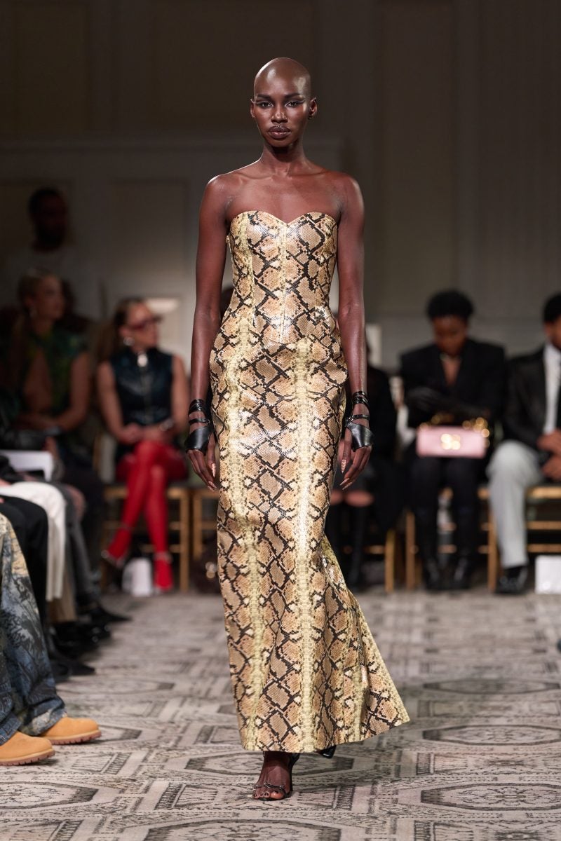 Immediately a theme of sensuality is present on the runway with models dressed in textured suiting, suit dresses, and matching power sets. These pieces are a subversive play on masculinity, creating a blank canvas for the body’s identity to be deconstructed and reconstructed all at once. Shui’s influence from artist Monica Bonvicini is seen on the runway in the form of her leather belts and handcuffs, a motif that fits into the brand universe with ease. Western wear and Chinese embroidery are prevalent in the collection with “K” adorned bolero ties around collared necks, fur trimmed jackets and cowboy shaped fur hats. Qipao collars adorn jackets and tops as a nod to Shui’s heritage while the serpentine shaped fur trims of two snakes embracing symbolize renewal, as it’s the year of the snake. Speaking of, snake print is utilized in a way that isn’t on-the-nose on the structured pants and a strapless leather dress.