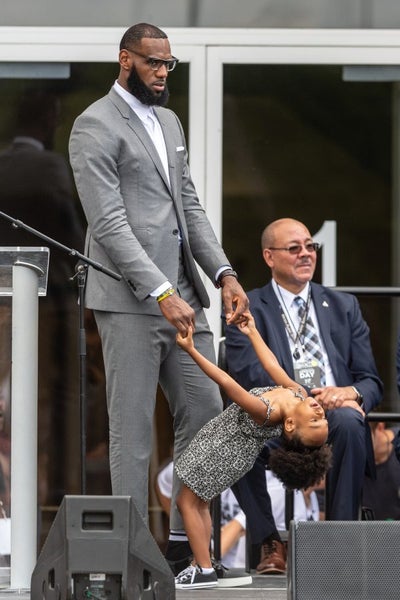 AKRON, OH – JULY 30: LeBron James plays with his daughter Zhuri during the opening ceremonies of the I Promise School on July 30, 2018 in Akron, Ohio. The School is a partnership between the LeBron James Family foundation and the Akron Public School and is designed to serve Akron’s most challenged students. (Photo by Jason Miller/Getty Images)